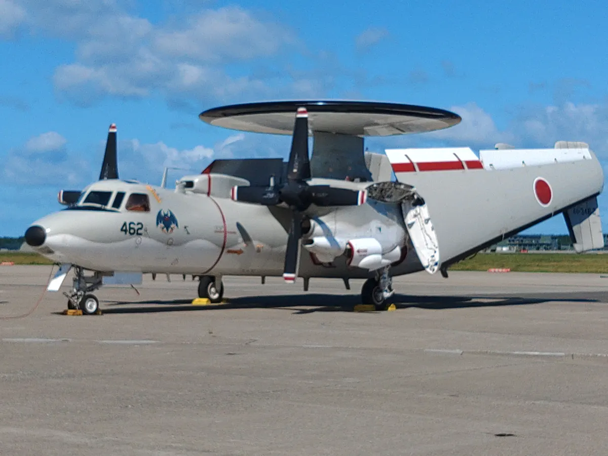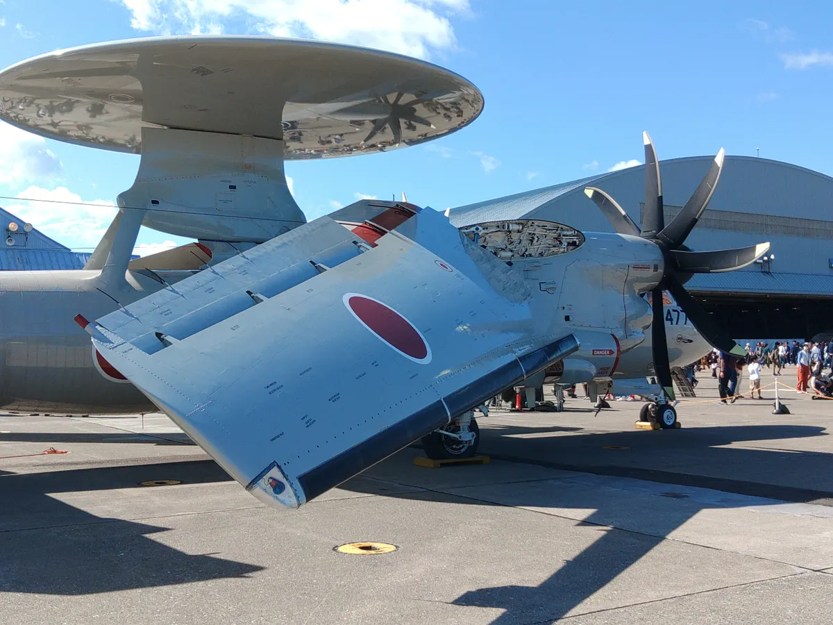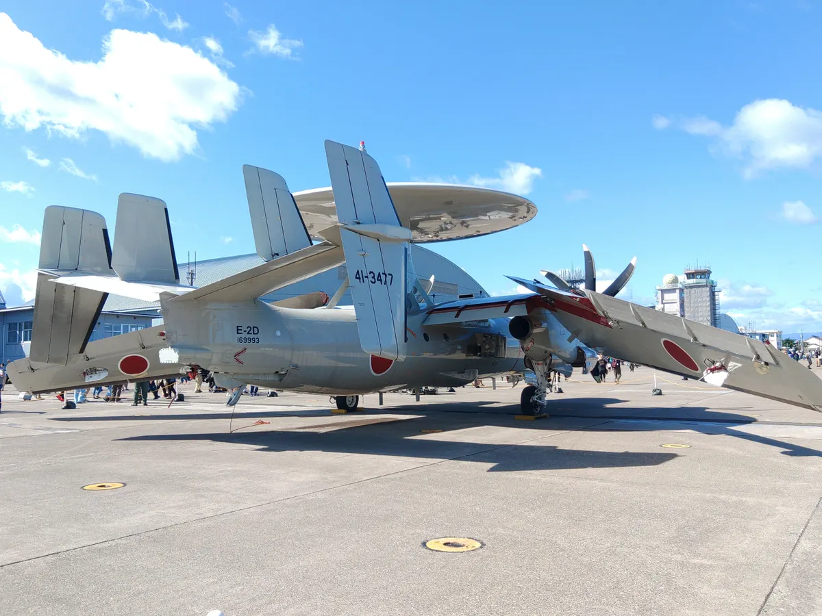 早期警戒機E2Dです。もともと空母に載せていた艦載機なので主翼が折りたためます。途中まで畳んでます。