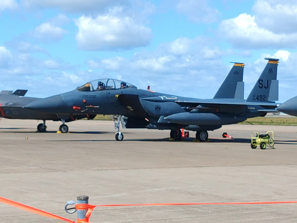 今年の航空祭で、一番驚いたのがこれ。F15Eが来ていました。戦闘爆撃機として運用される機体で、機体側面に一体型のコンフォーマルタンクが装備されているのが特徴です。えええ~いったいどこから?と思ってテールレターで調べてみたら、アメリカ本土のノースカロライナ州シーモア・ジョンソン空軍基地所属の機体でした。沖縄嘉手納基地に暫定配備されているようです。
