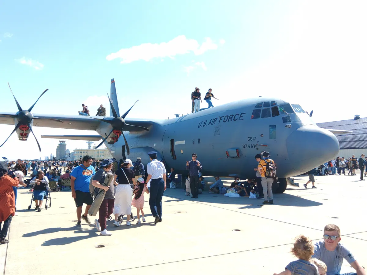 米空軍の輸送機C130ハーキュリーズです。米空軍の人たちが機体の上で寛いでいました。