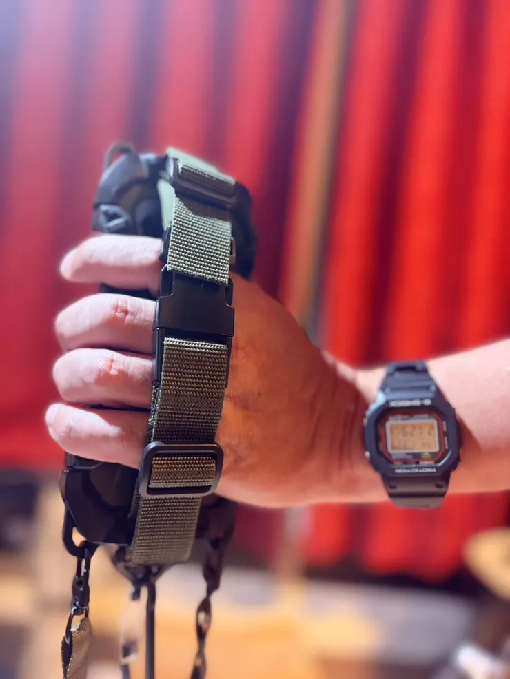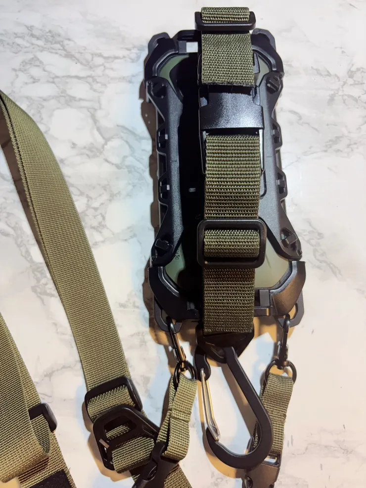 ▷見た目もゴツいし格好良いです。ネックストラップで落とさない、ネックストラップを外しても落下防止ストラップで落とさない、落としたとしてもマルチホルダー、ハードホルダーで全身保護してるから大丈夫❗️落下防止ストラップはベルト式なので外せば写真も動画も撮影出来る仕様。カラビナ付きで便利です