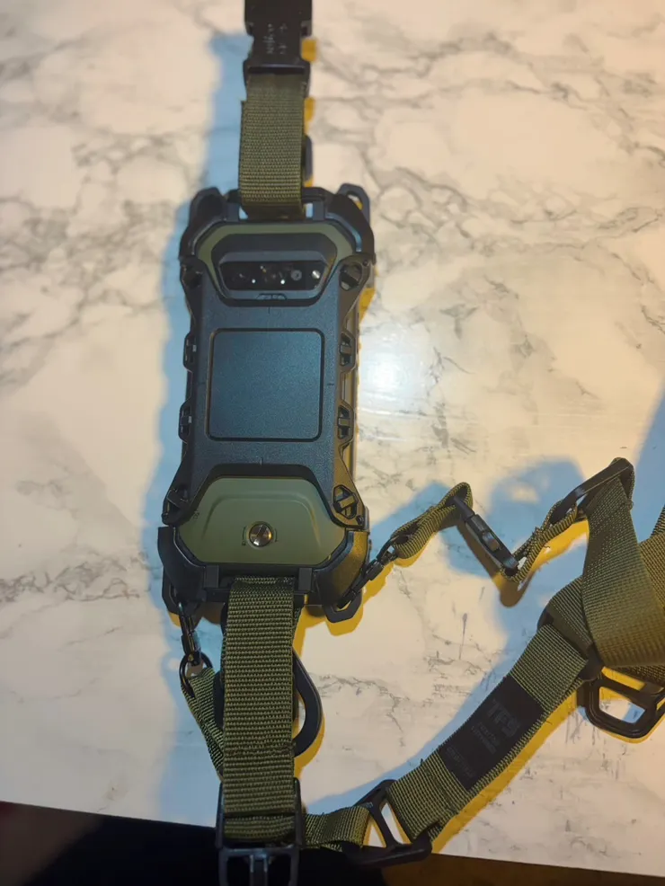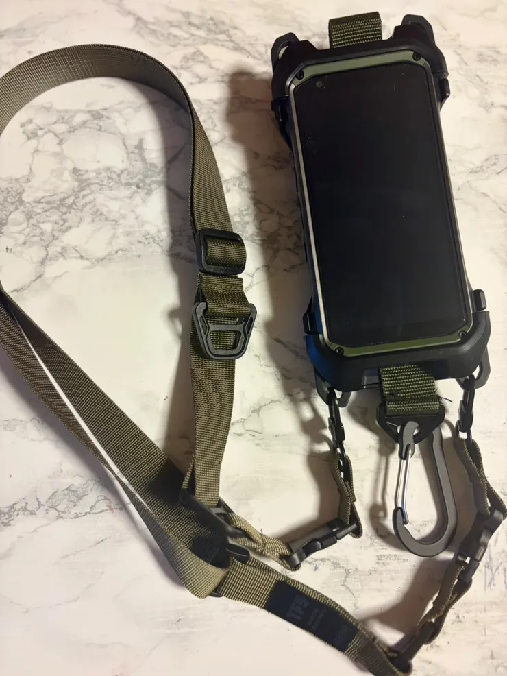 ▷見た目もゴツいし格好良いです。ネックストラップで落とさない、ネックストラップを外しても落下防止ストラップで落とさない、落としたとしてもマルチホルダー、ハードホルダーで全身保護してるから大丈夫❗️落下防止ストラップはベルト式なので外せば写真も動画も撮影出来る仕様。カラビナ付きで便利です