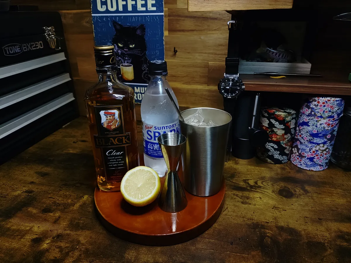 風呂から上がったら、保冷のステンレスタンブラーに大きめの氷をゴロゴロいれて‥ブラッククリアーをきっちりメジャーカップでシングル2杯(つまりダブルやね)計って投入。キンキンに冷えた炭酸をなるべく泡立てないよう注ぐ。レモンもしくはライムをチョイと絞ってマドラーで軽く上下に2回撹拌‥これで極上ハイボールの出来上がり😺
