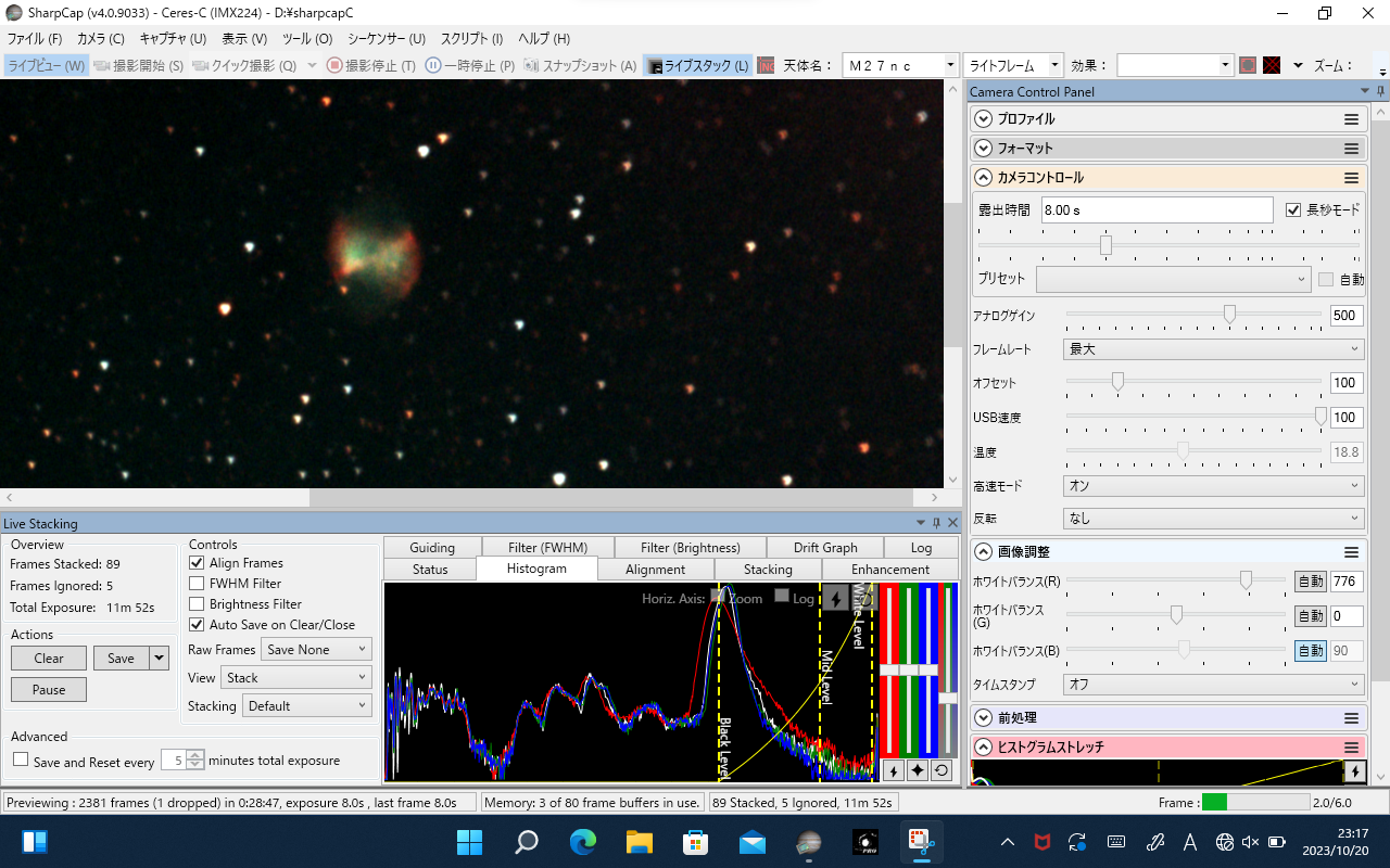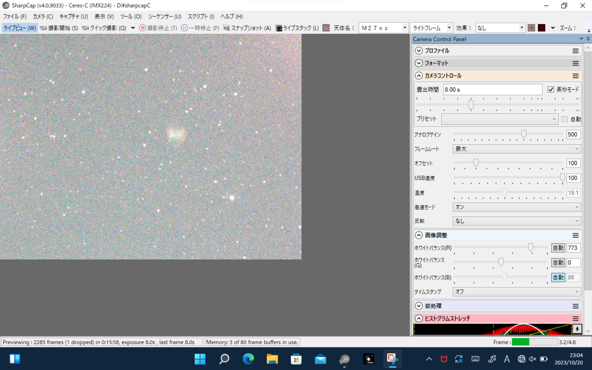 これまた1年ぶりのこぎつね座の亜鈴状星雲M27 明るさは7.4ですが視直径8.0' × 5.7なので電視観望ならすぐに見つかります。