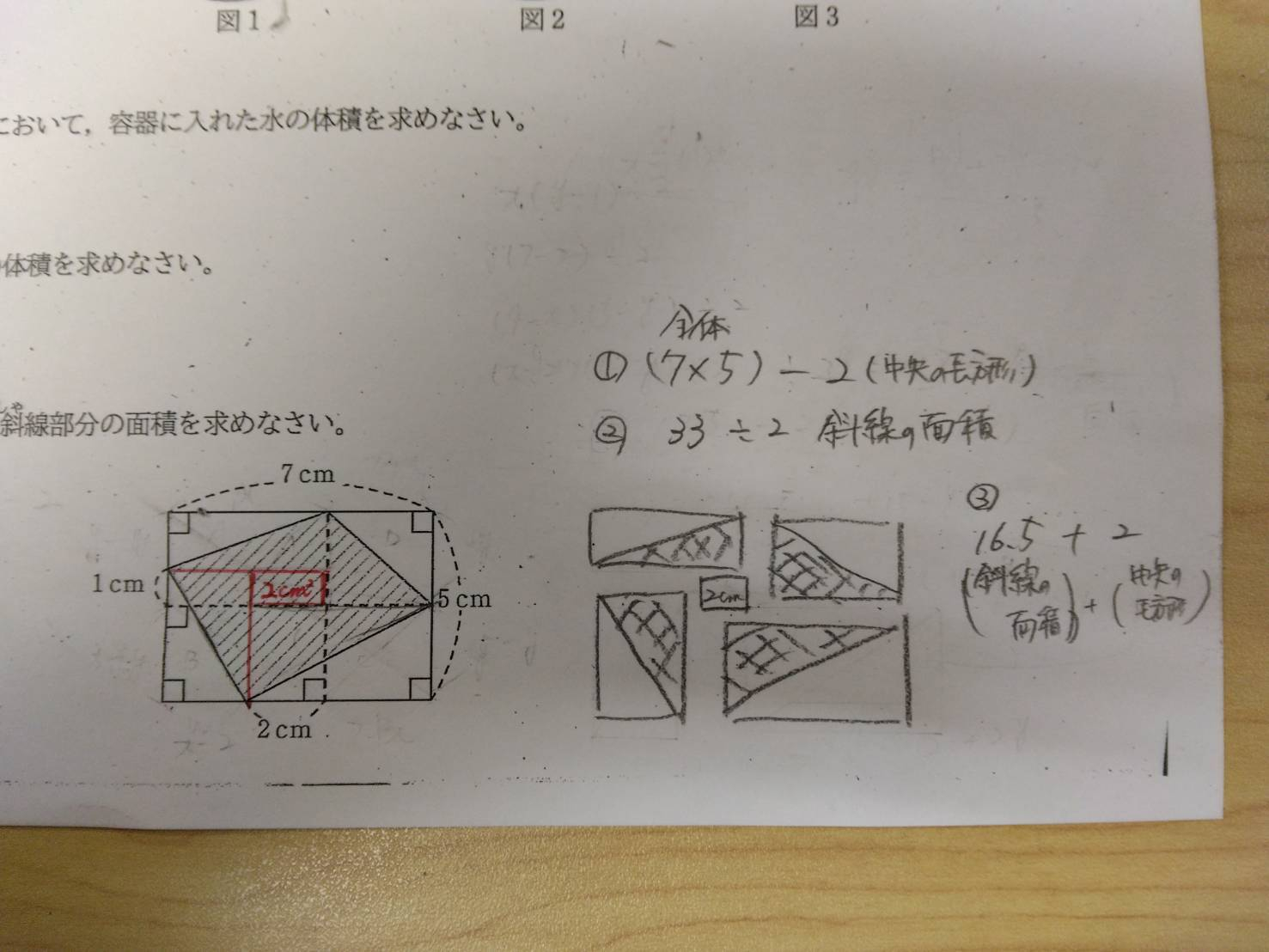 「正解発表」に間に合いませんでしたが😅、当方も大体同じように分割して答えを導きました。「Mimikyu」さんの解法が多分一番すっきりした方法のように思います。1㎝(縦方向)、2㎝(横方向)の寸法表示がニクいですね。🤗