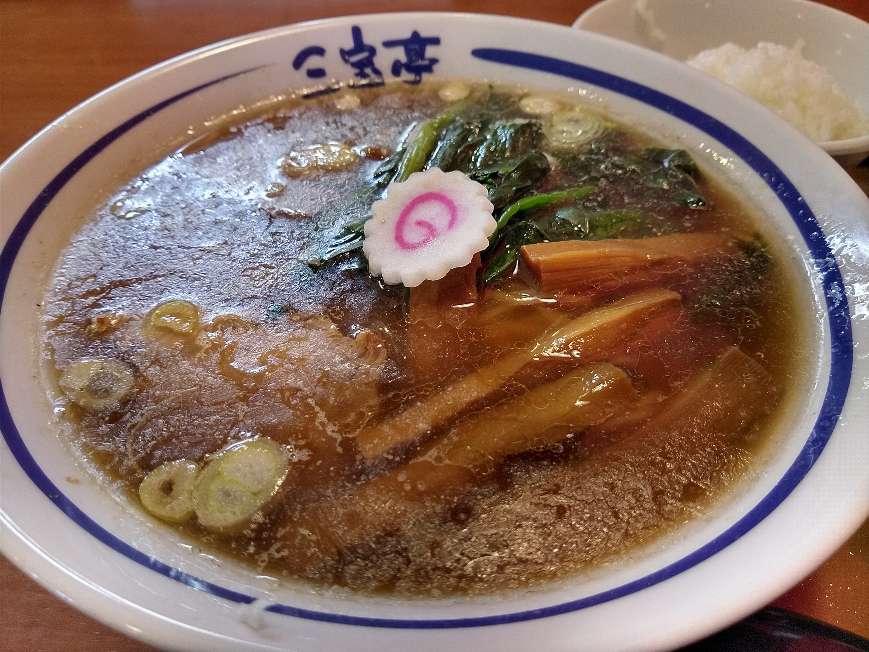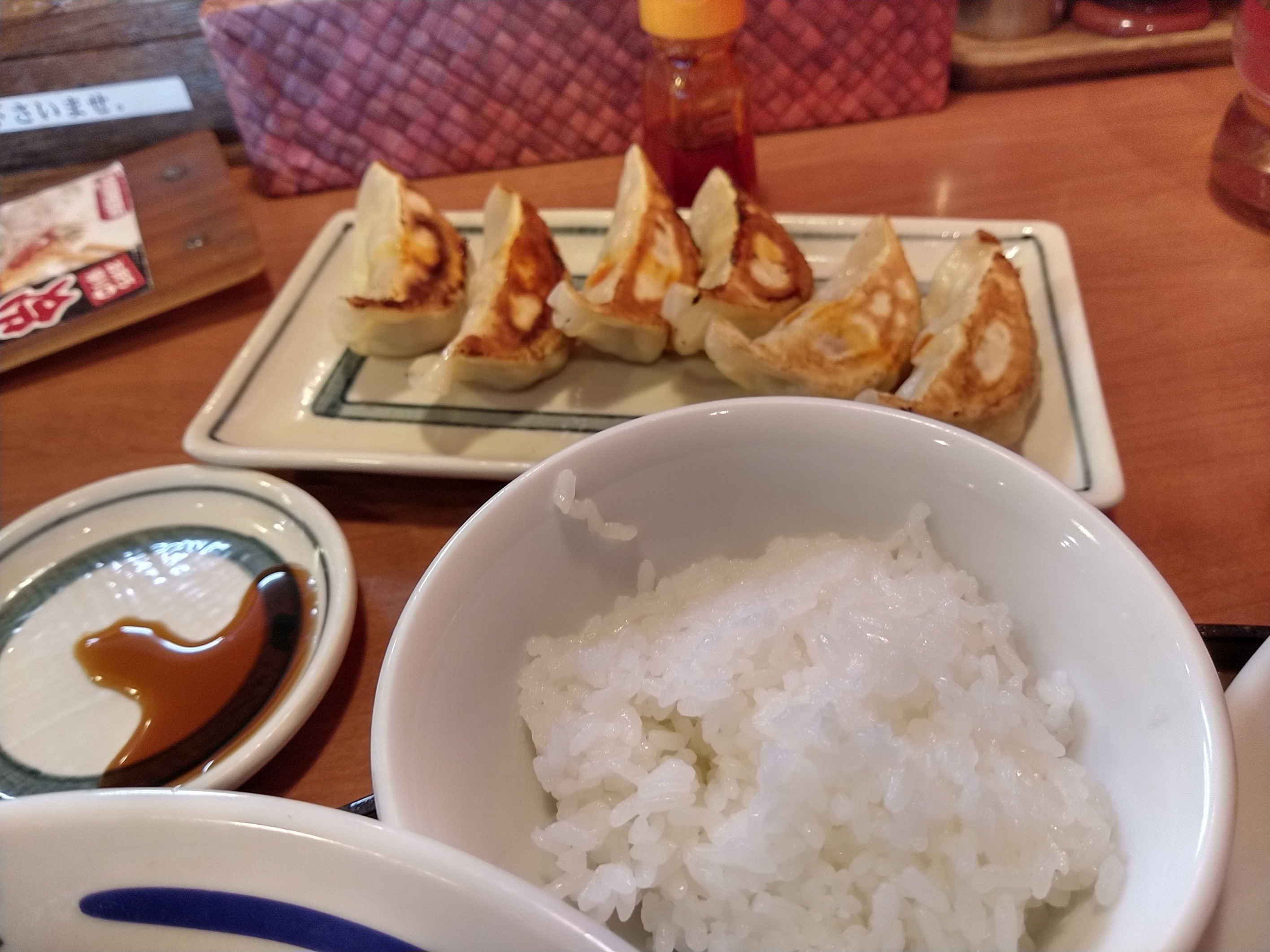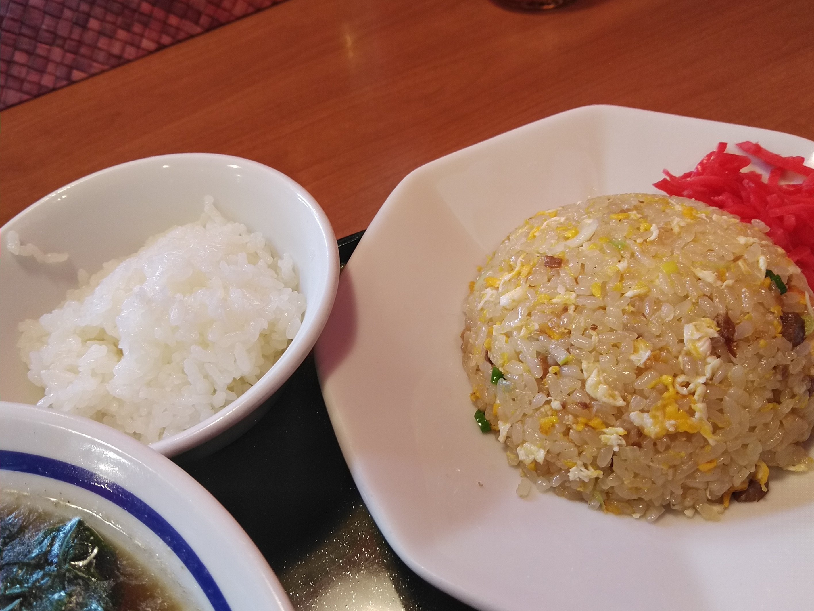 \(^-^)/平日昼のみのハズと思い込んでいた、半ライス無料サービスが土日もあった事を知らずにラーメン+半チャーハンセットと餃子を注文したところ、半ライスはつけますか?無料ですと言われ半ライスをつけてしまいまいたYO 半チャーハン+半ライスってもう満腹でした。