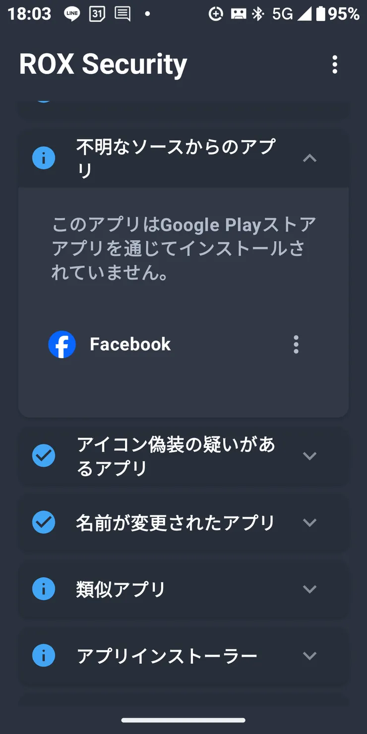 私のトップ画像をご覧頂けばわかると思いますが、Facebookが二個見えると思います。このアプリROX Securityはこのような成りすましアプリや詐欺サイトを検出し、削除を促します。