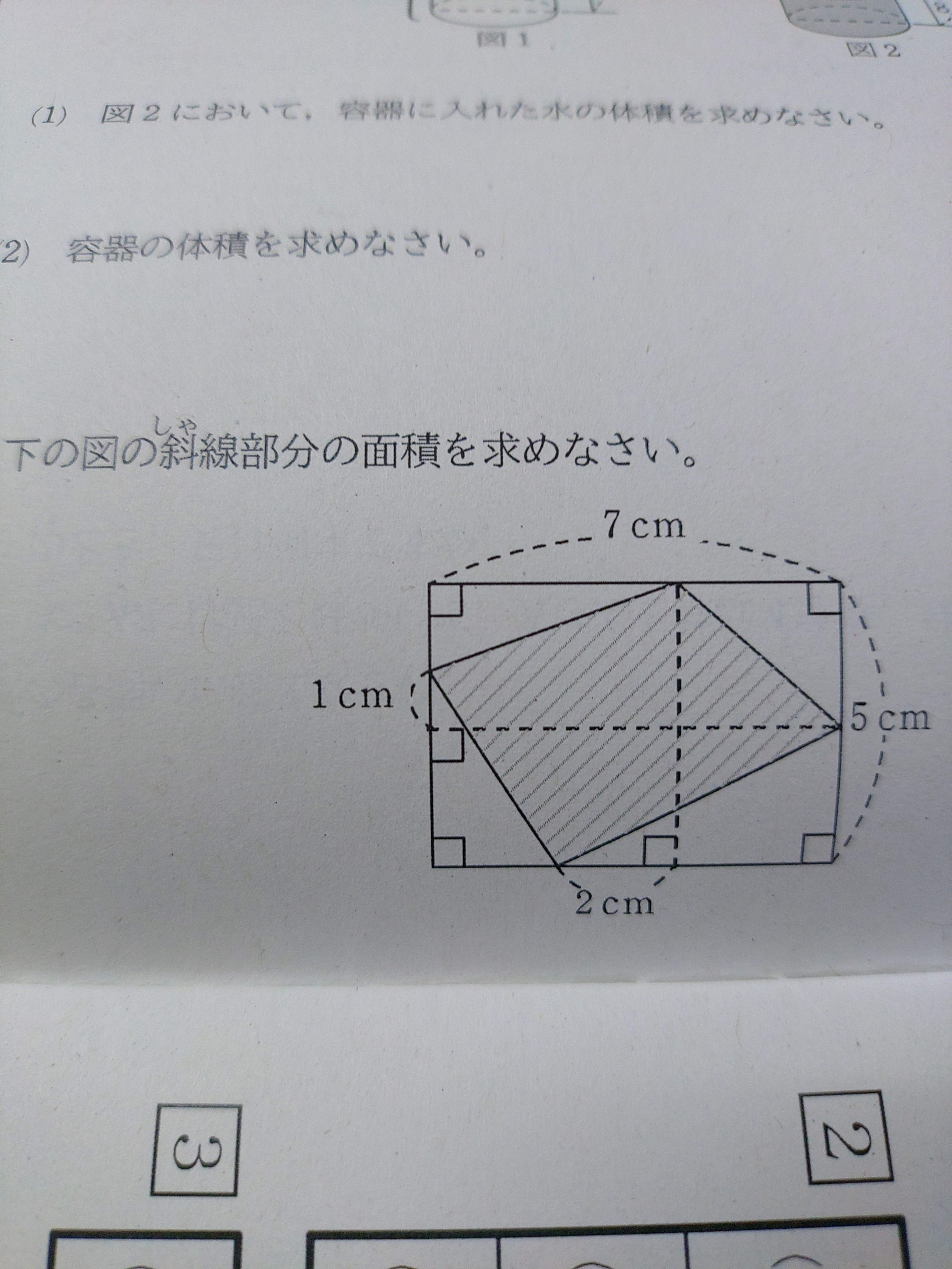 投稿を表示四角(7×5)-右上(2と1/2×3÷2)-右下(2と1/2×5÷2)-左上(1と1/2×4÷2)-左下(3と1/2×2÷2)=斜線面積18.5