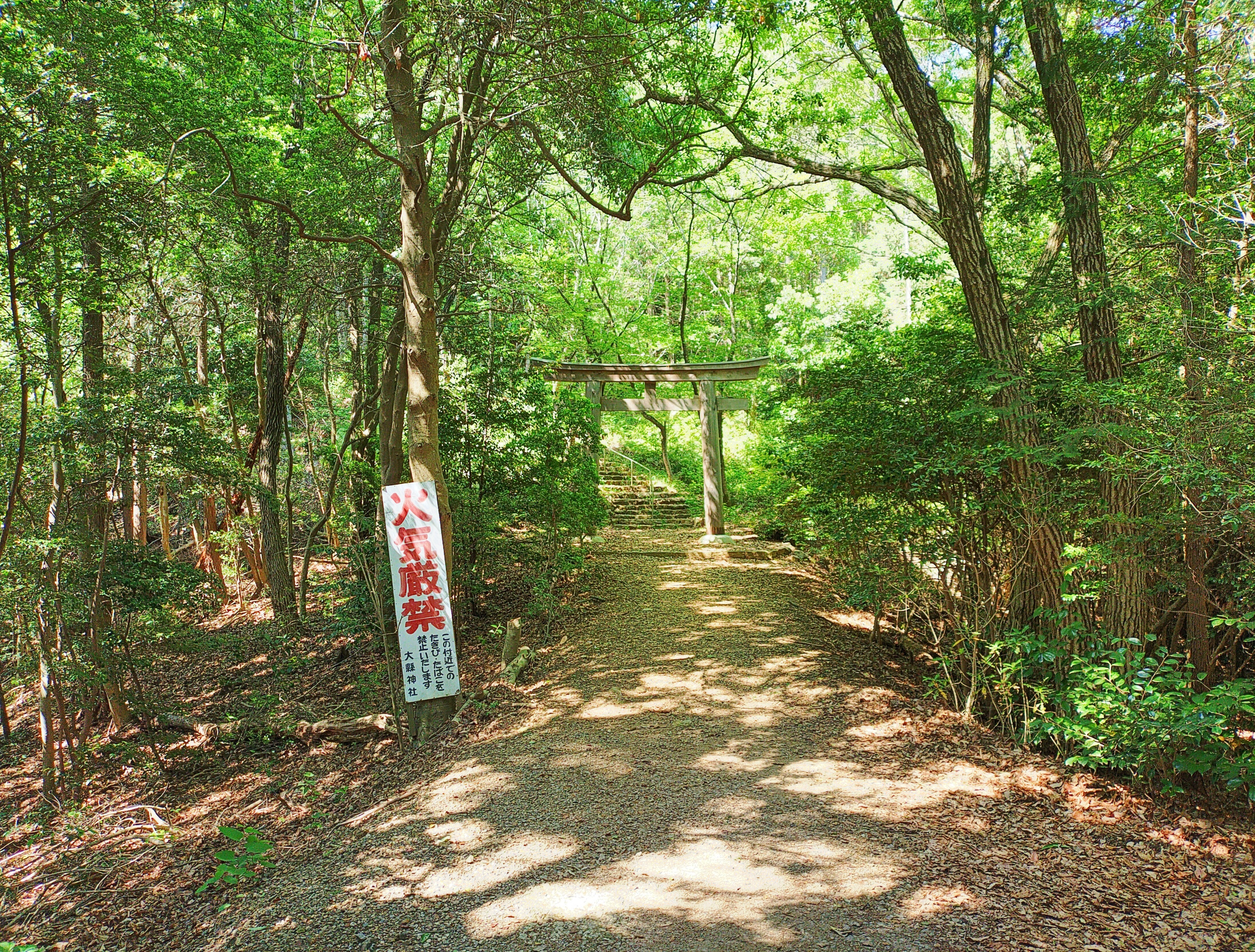 更に砂利で敷き詰められた、緩やかな山道を登って行くと鳥居の奥に手すり付きの石段がある。
