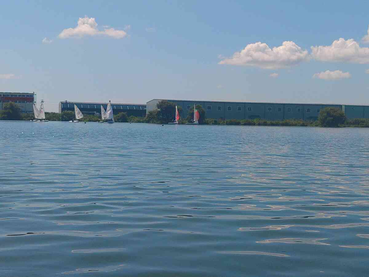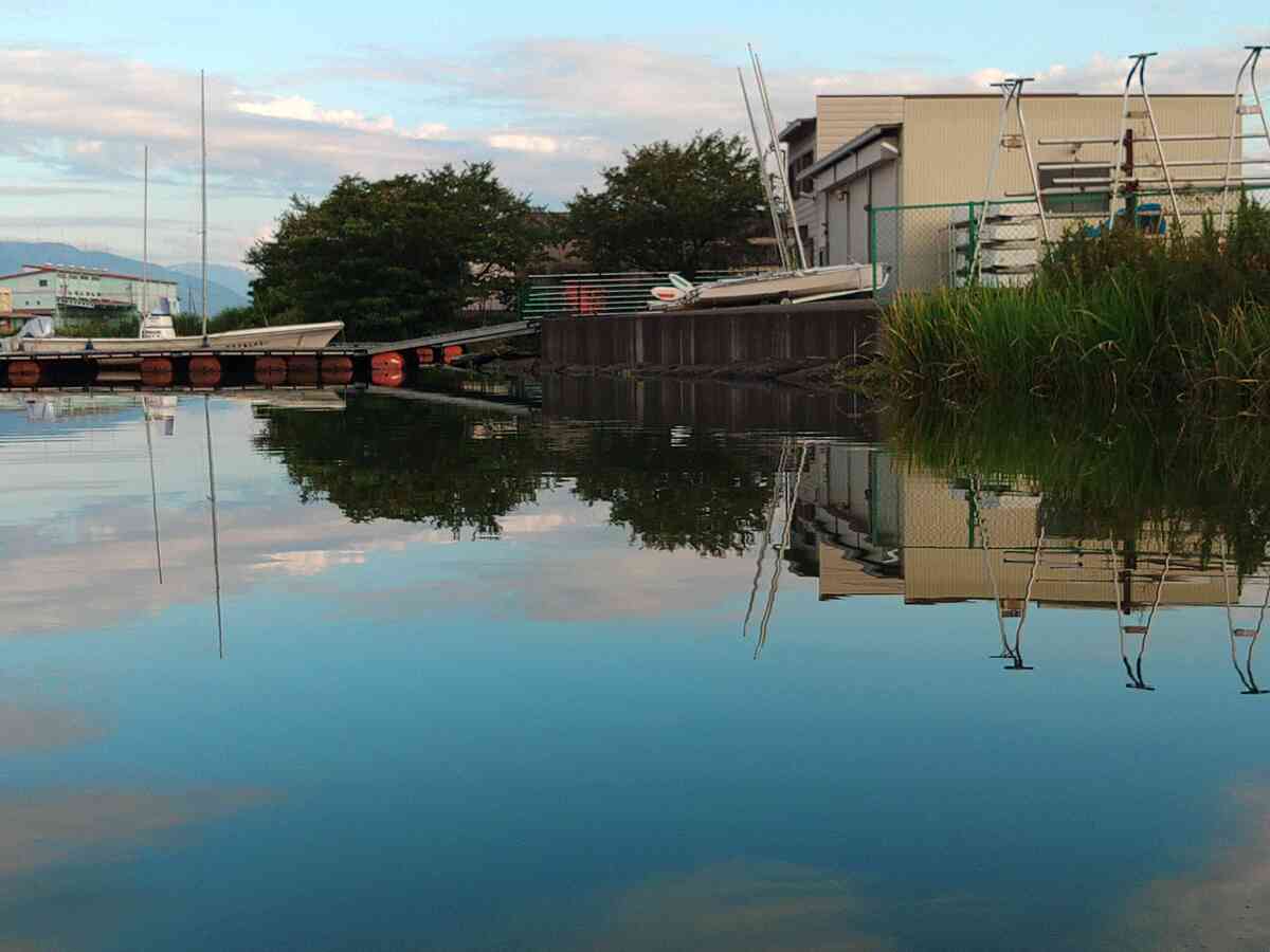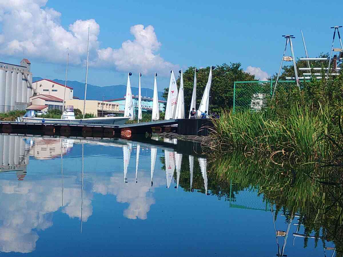 ヨット部の桟橋の岸からの角度を注意して見て欲しい。