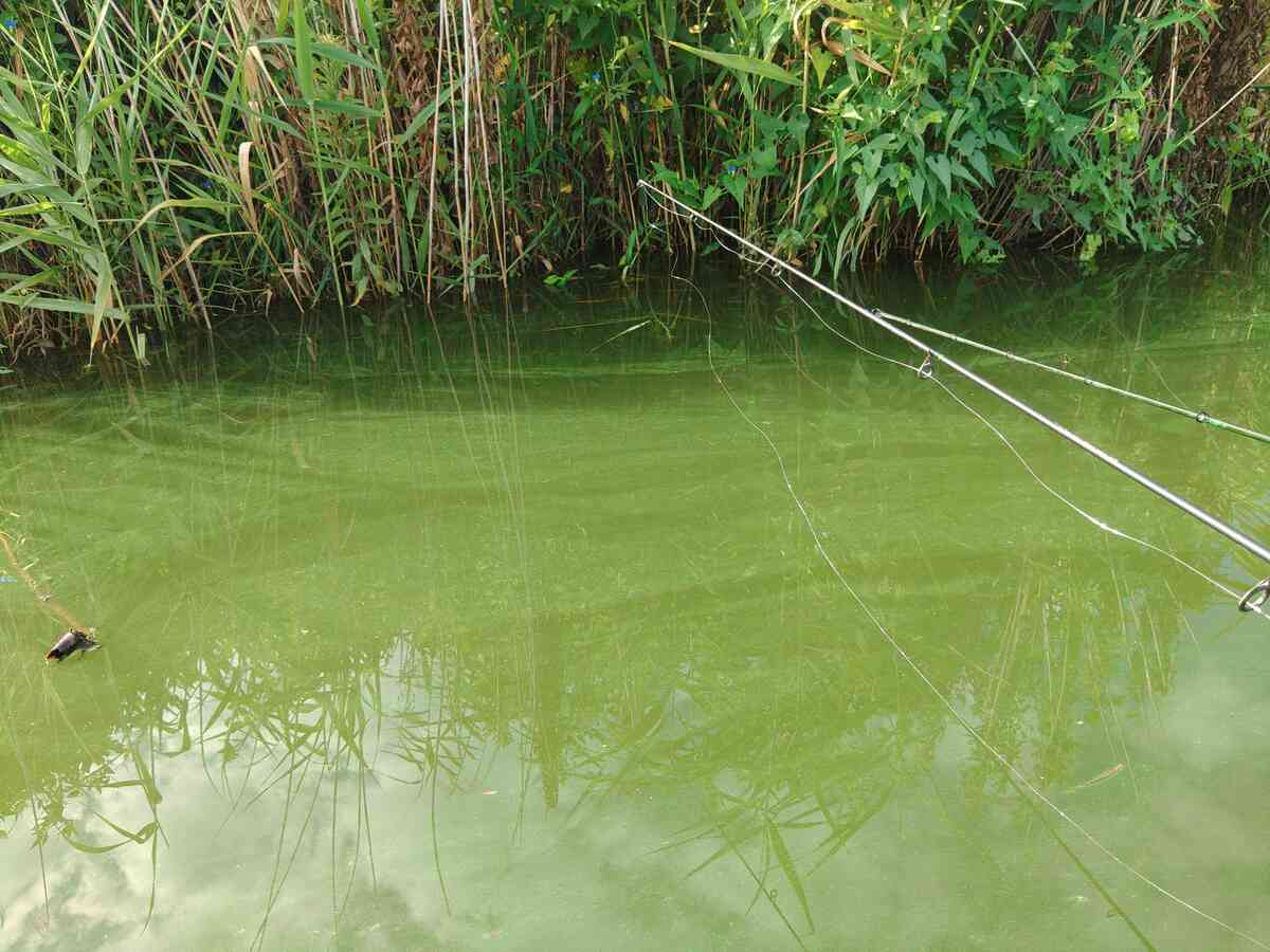 アシ際を見てすぐ 水面上に青粉が浮いている。