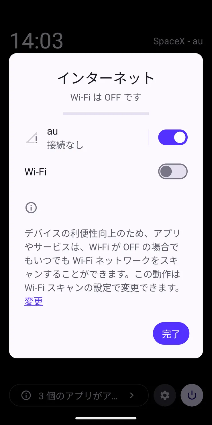 Wi-Fiは関係なさそうです。繋がったら通知で衛星と接続されました。表示されます