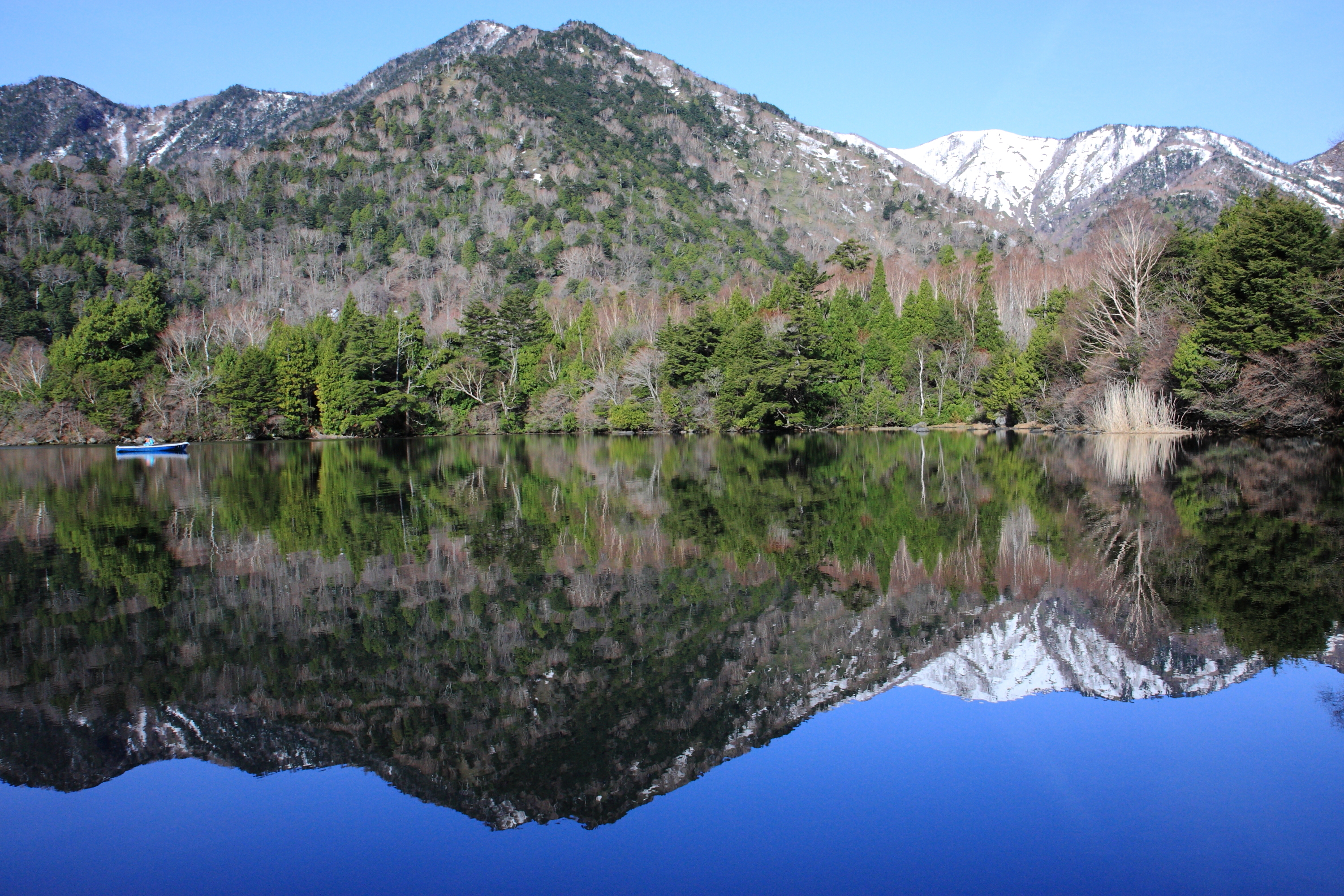 写真はGWの湯ノ湖。それほど大きな湖ではないので、無風のベタ凪になると、稀に湖面が完璧な鏡面になる事があります。NDフィルター装着で反射を抑えると鏡像の方が濃く深く映ります。