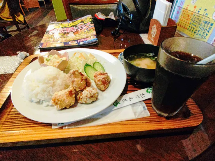 まずは由仁町 ユニカフェにて早めの昼ご飯。唐揚げ定食600円、グラスなみなみのコーラがセットで600円。やっす〜い!社長、ありがとう〜!!
