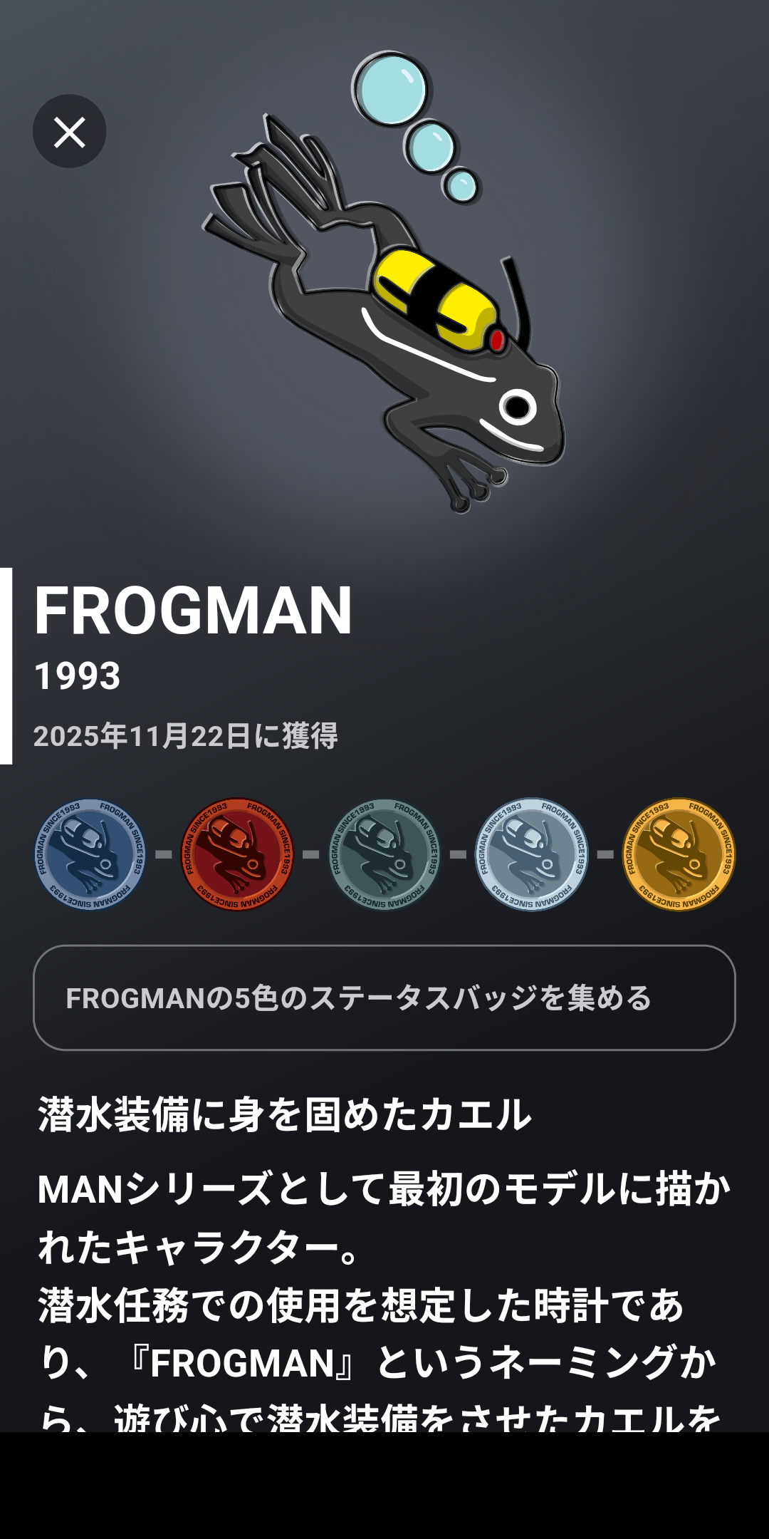 トップ > TORQUEフォト > CASIOウォッチズのバッジ📛2 ノリ 2025/12/10 07:58 CASIOウォッチズのバッジ📛2 こんな画面が出て来ました❢ いいね 共有する 共有する X facebook LINE リンクをコピー コメントする 1 件の返信 (新着順) ミュートしたユーザーの投稿です。 投稿を表示 にしもん@50s pro 2025/12/11 11:13 一応肺呼吸ですから✨👍😀🐸💪 いいね 返信する ミュートしたユーザーの投稿です。 投稿を表示 ノリ 2025/12/11 12:30 にしもん@50s pro 人間と同じ… GSHOCKのフロッグマンを見た時は衝撃的🎯でした😊 既にブーム時期にあり、通常モデルでさえ、手に入らない時代でした😊 いいね 返信する