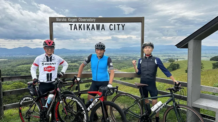 スキー場降りて、倉本聰のドラマ「昨日、悲別で」のロケ地「悲別ロマン座」の前で記念撮影、そしてまた、「とてもいいフォトジェニックな所あるからぁ~!!」と滝川の丸加高原まで登らされ、ここも12~16%の登り。確かにフォトジェニックな撮影ポイントでしたがもうヘロヘロで、残り30kmはリハビリのAさんは体力使い果たし、20km以上出ない始末で雨まで降ってきました。