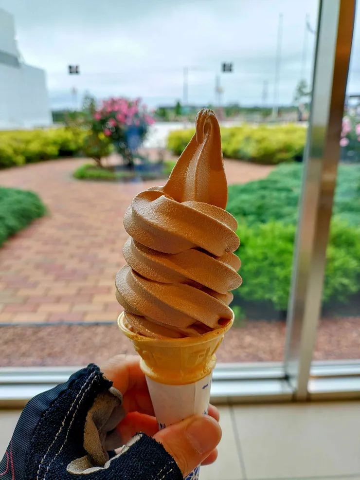ここでしか食べられないチョコレートのソフトクリームと、パンを食べて回復し、風も収まらないし気温も18度と寒いので諦めて帰りました。