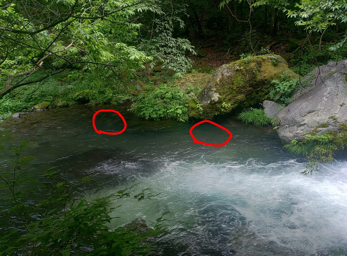 例えば上の画像の右側マークみたいな反転流や、左の垂れた枝下の淀み。こういう好ポイントに対岸下流から正確にキャストしないと釣果は上がりません。