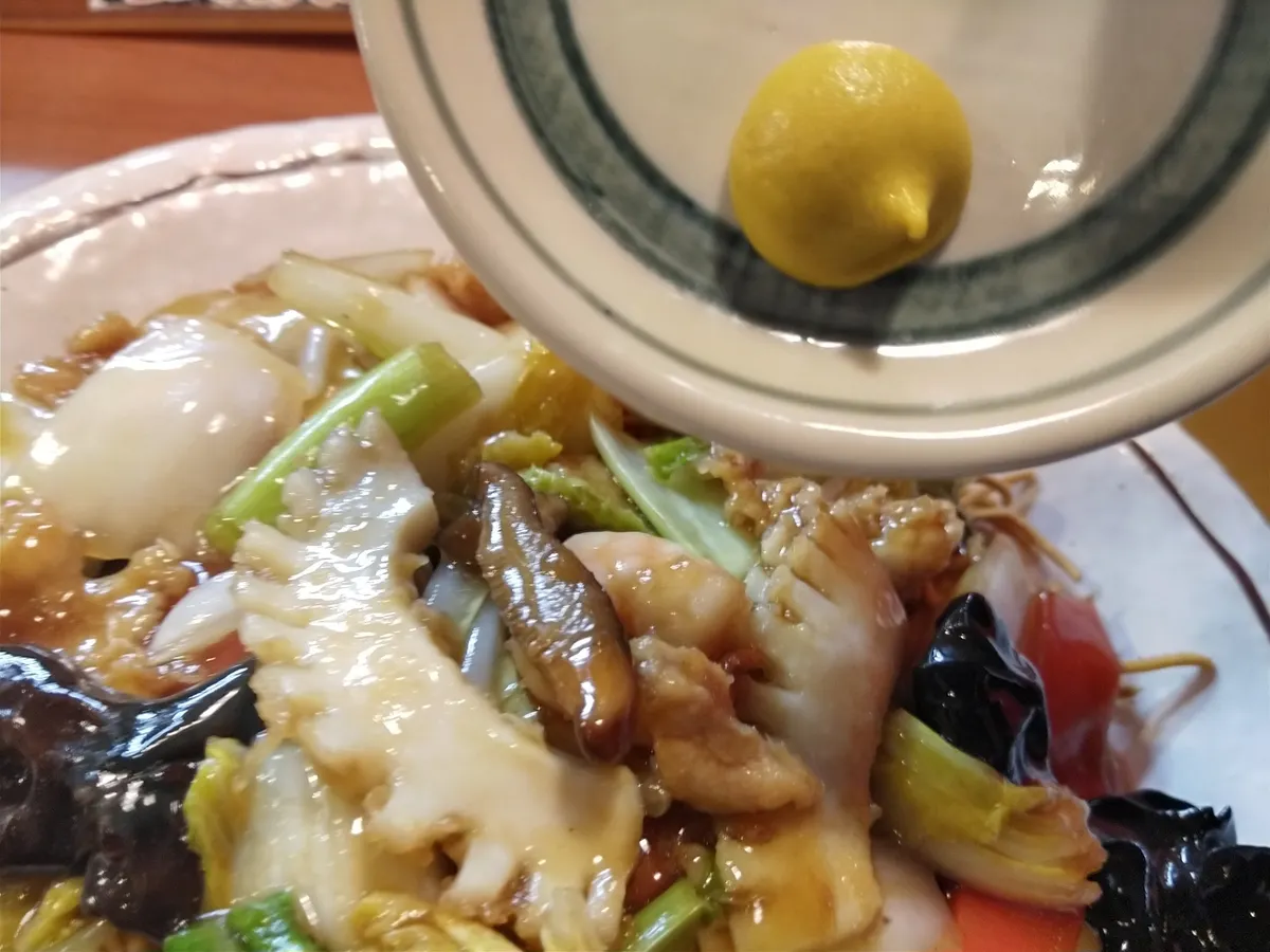 野菜はシャキシャキしていて海老烏賊豚肉がちゃんと油通ししてあって餡が絡んで