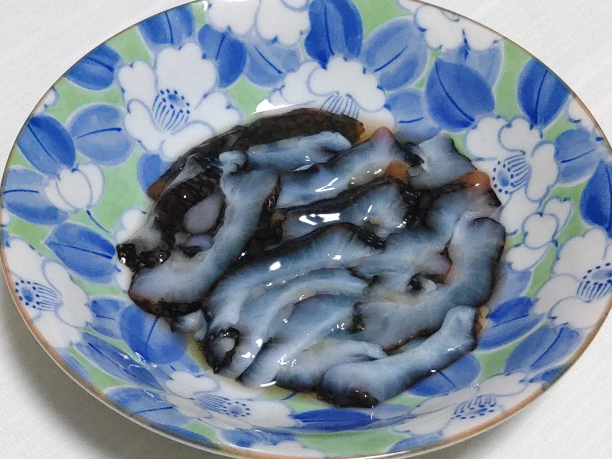 水道水で洗い、両端(口と排出口)を切り落とし、腹側(大きい突起のないほう)を縦に切ります。筒状になっているので、断面の形状としては視力を測定するときの環のような形になります。内部の内臓や砂をきれいに洗い、薄く切って出来上がり。