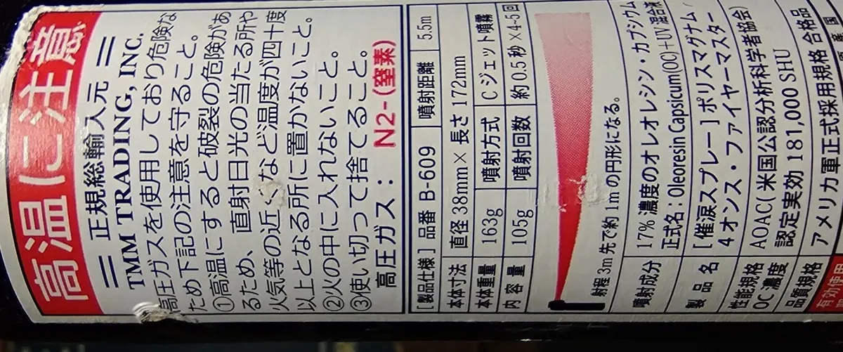 熊スプレー「ポリスマグナム」ツキノワグマ用に威力を抑えてありますが、誤射で浴びたらかなりヤバいらしい💧