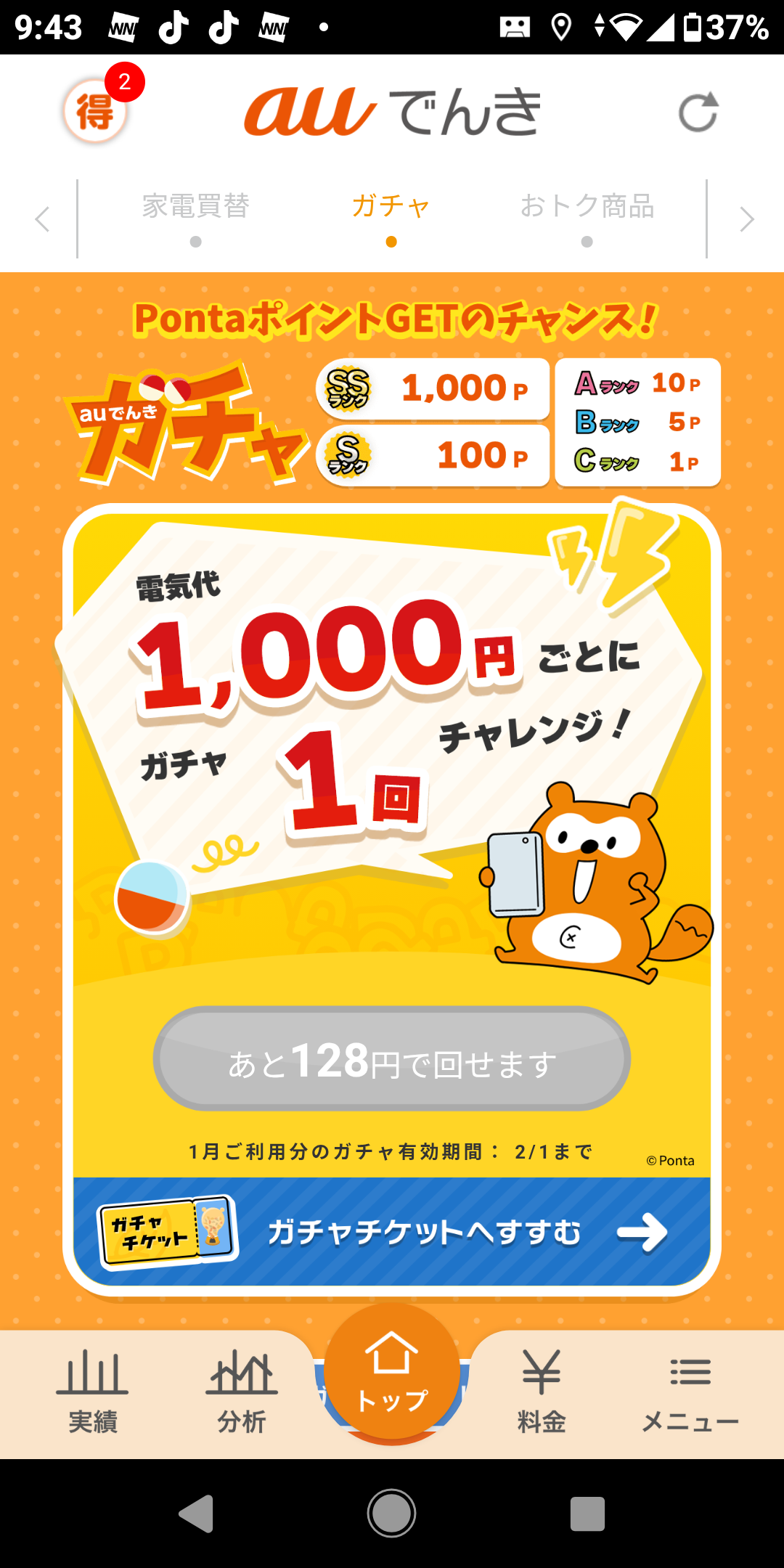 トップ > TORQUEフォト > あと128円・・・ ran 2026/01/19 09:47 あと128円・・・ おはようございます😊 以前、au電気のガチャでSSランク1,000円当てた方がいらっしゃいましたね!! 私はAまでしか当たりません。(;_;)皆さんはSSとかSランク引き当ててますか?🤔 いいね 共有する 共有する X facebook LINE リンクをコピー コメントする 2 件の返信 (新着順) ミュートしたユーザーの投稿です。 投稿を表示 ran 2026/01/20 08:21 やっぱりな〜 10ポイント😆 いいね 返信する ミュートしたユーザーの投稿です。 投稿を表示 にしもん@50s pro 2026/01/19 18:35 当たった事が無いです😱💧🍺 いいね 返信する