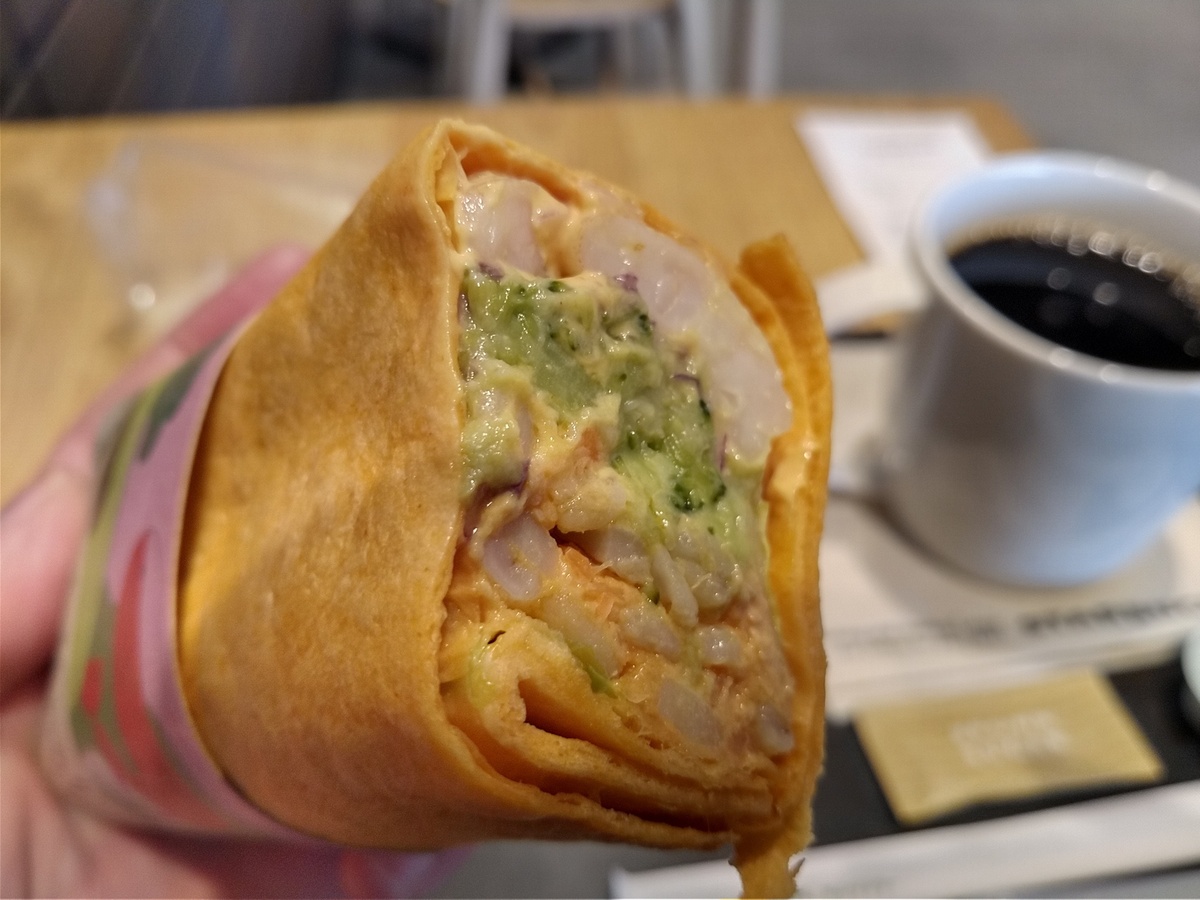 サラダラップを初めて食べてみたところ、アボカドサラダ、エビ、