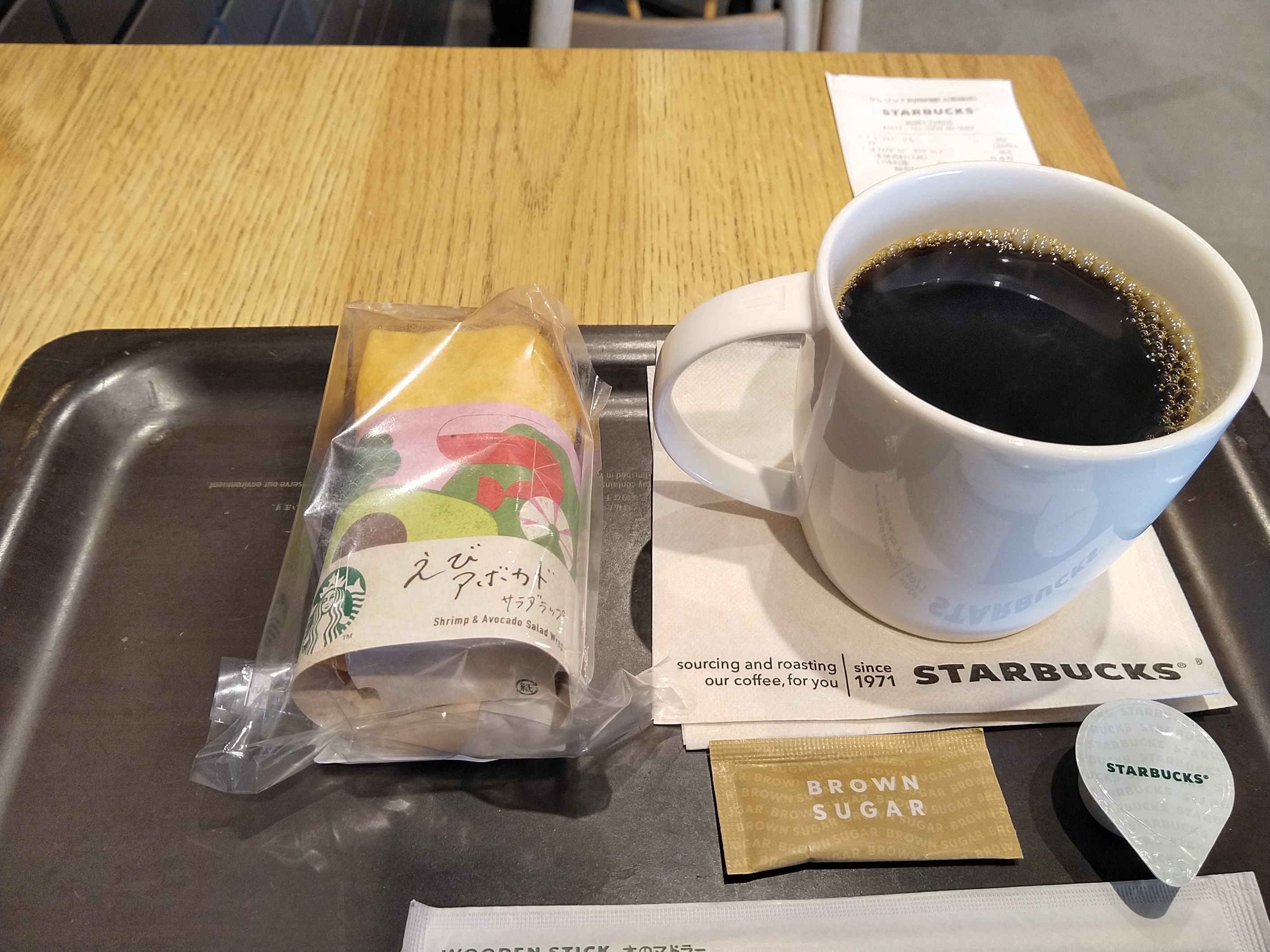 (^-^)おはようございます。スターバックスにてブレンドコーヒーとえびアボカド サラダラップです。