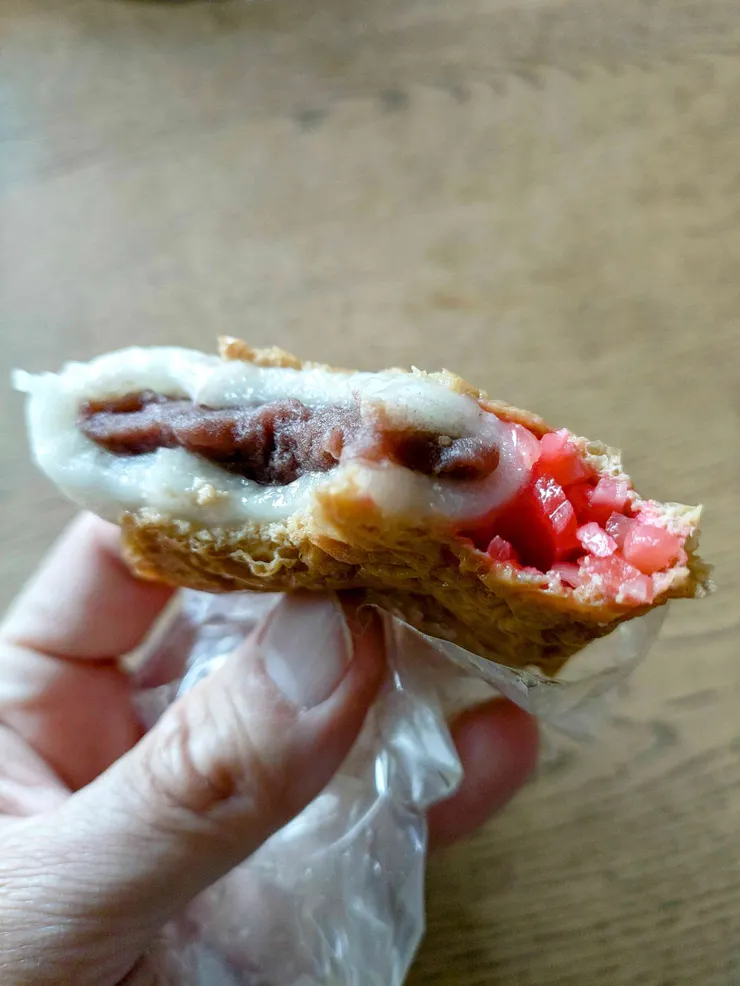 甘辛いお揚げの中に大福が包まれて餡の甘さが引き立つ!!