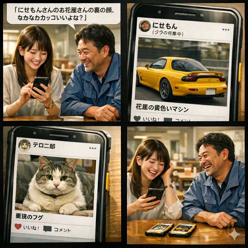 右の下(携帯画面): 画面に表示されている文字が何か違います。
