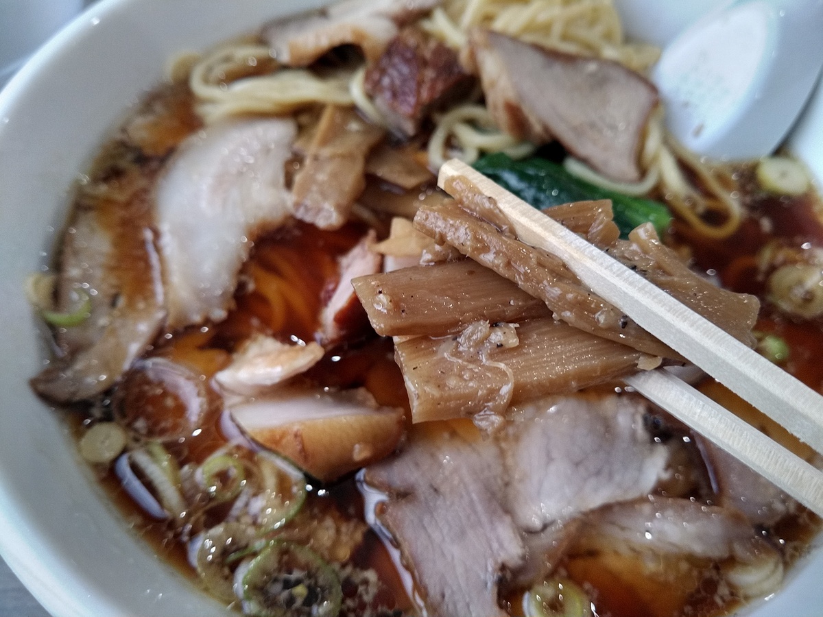 (^-^)以前投稿した日村さんが取材した店の本店から独立した長岡生姜醤油ラーメン店のチャーシュー麺普通盛りに麺とチャーシューが増されています。