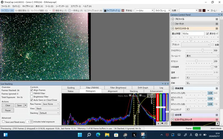あまり変わらないかもですがスタック数が約半分なのは鏡筒のおかげかな