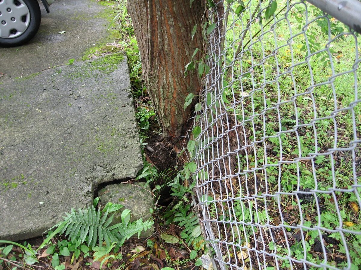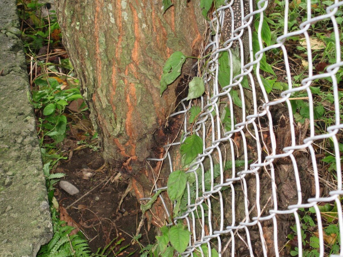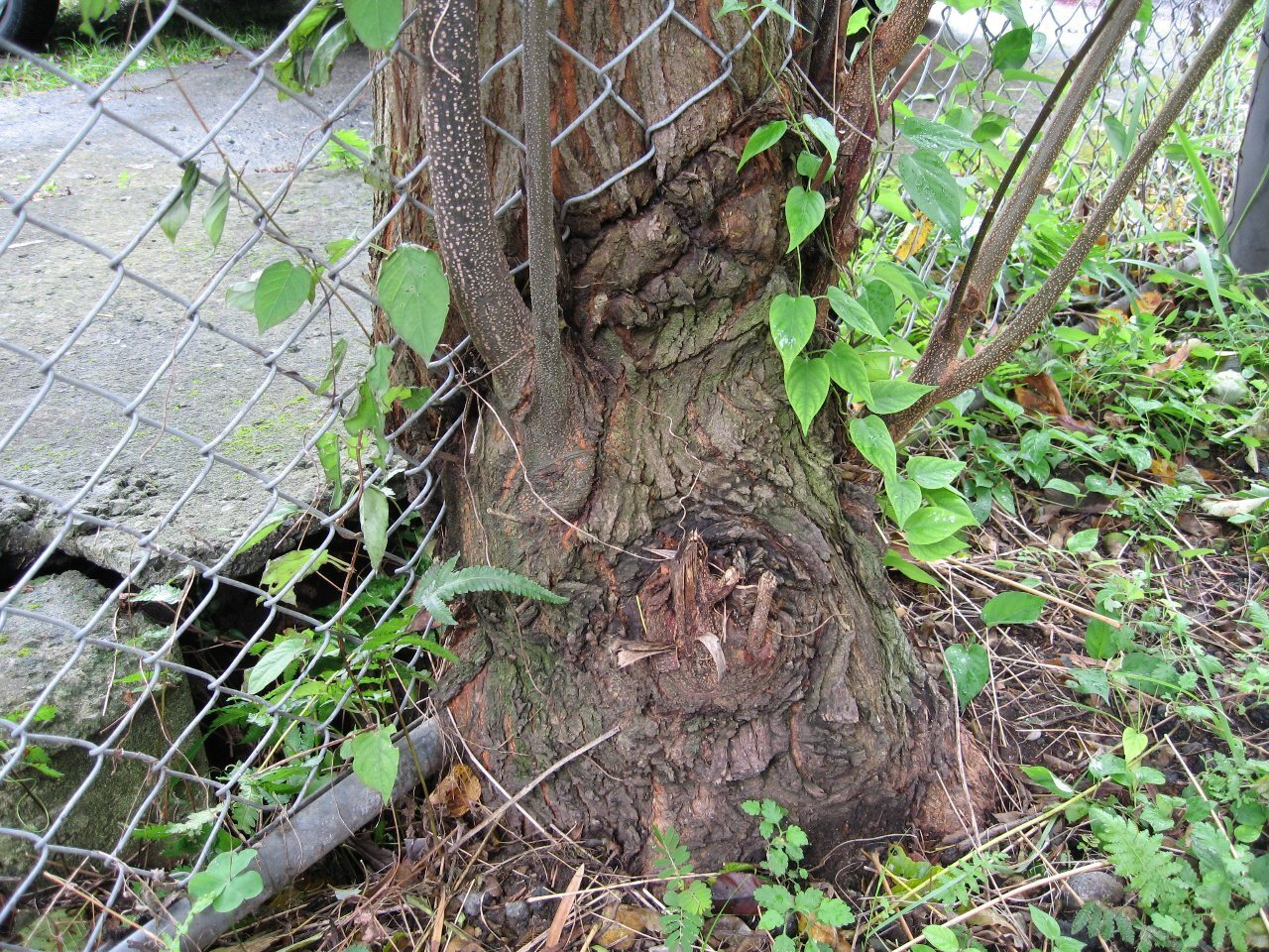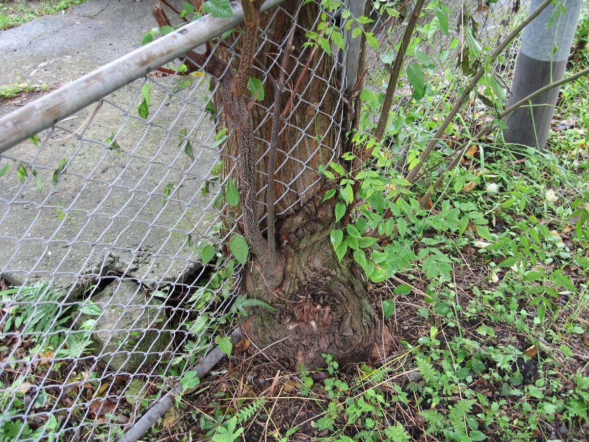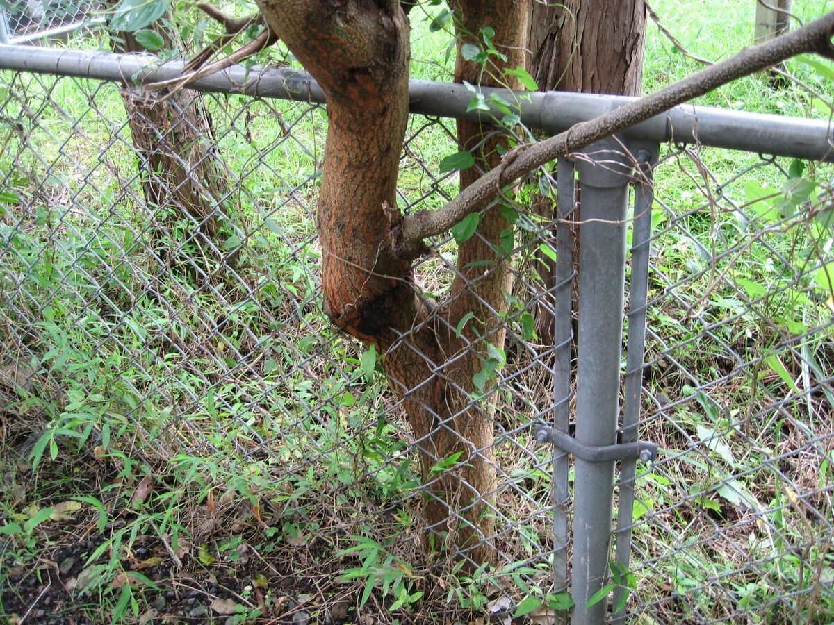 これは、以前近所の中学校のフェンス際に生えていた木です。樹皮の模様や周囲にたくさん生えていることからセンダンの木と思われます。推測ですが、木の実を食べた鳥がフェンスで休憩中に排泄して、そこから芽が出たと思われます。その後、芽がフェンスの網目を通って成長して行ったのでしょう。同じ様な状態の木がたくさん生えていました。何故こうなるまでほっといたと言う感じです。今は、全て伐り倒されました。