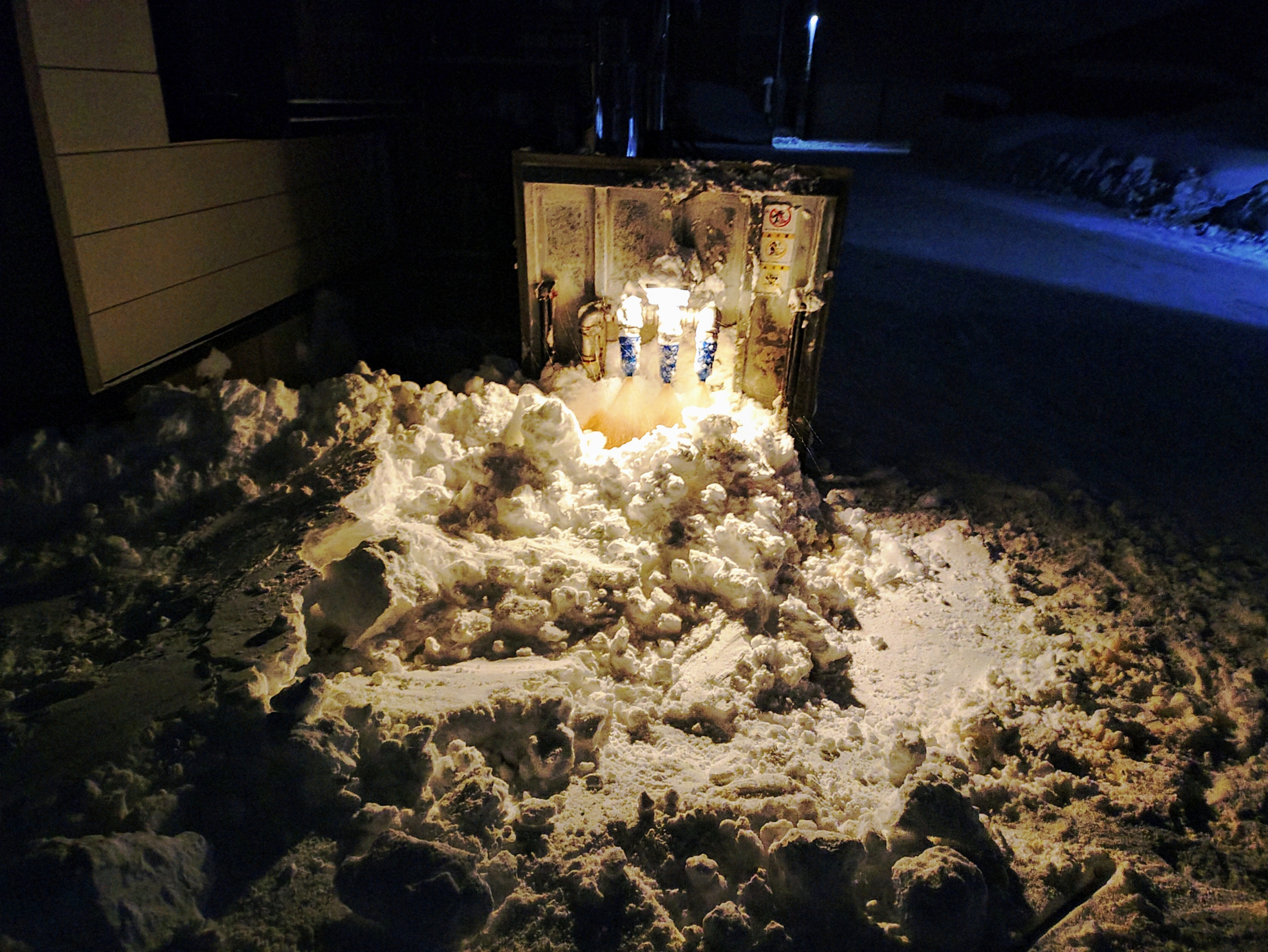 昨夜からの雪が多くて、人力だけでは間に合わず融雪装置を使います。灯油で熱水にして3本のノズルから噴射して溶かします。ゆうらく号という器械です。