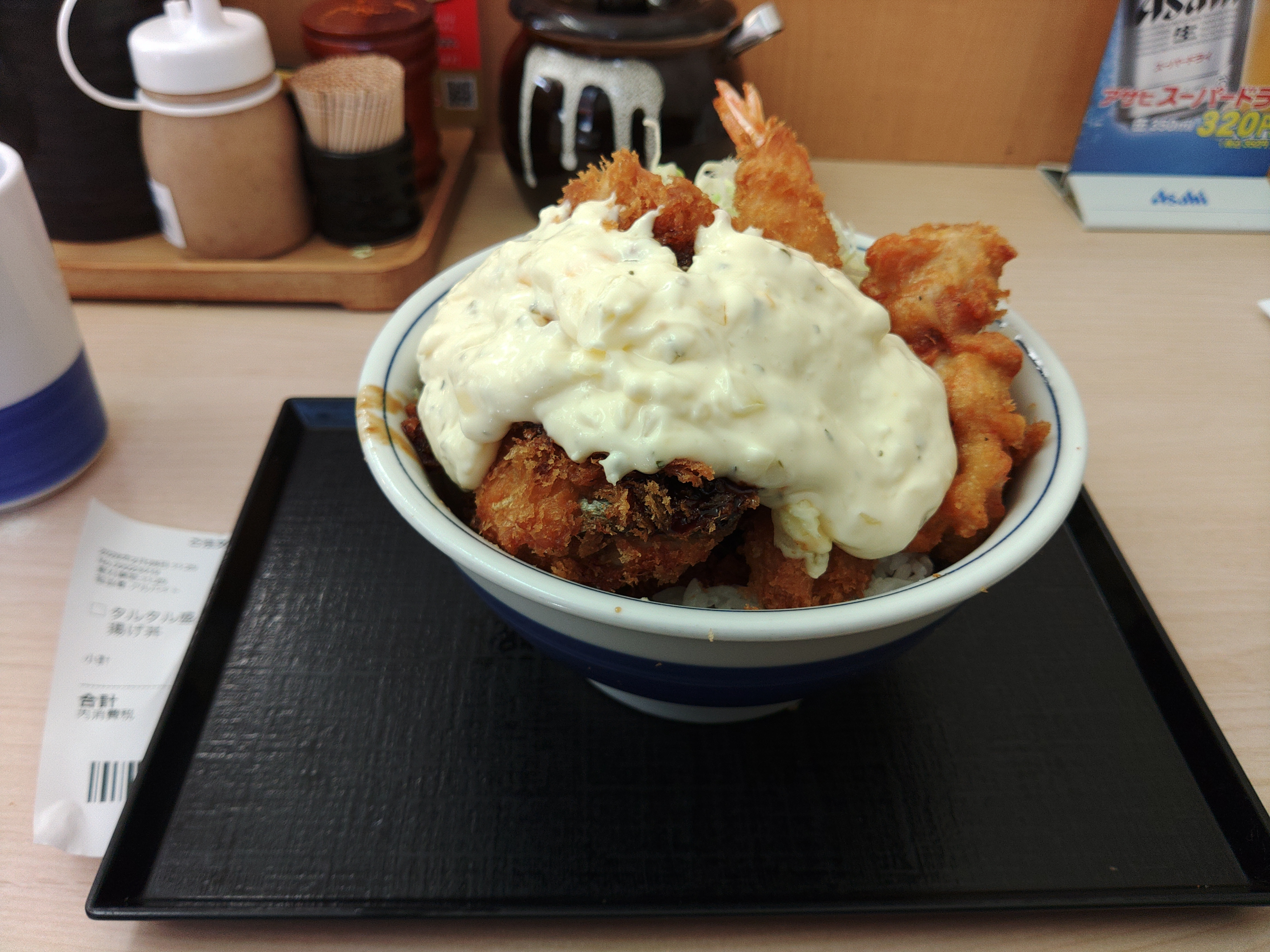 そして最近、メニューに載ったのが「タルタル盛り揚げ」、丼バージョンは千切りキャベツに鯖フライ・チキンカツ・唐揚げを乗せ、上からタルタルソースを掛けたモノになる