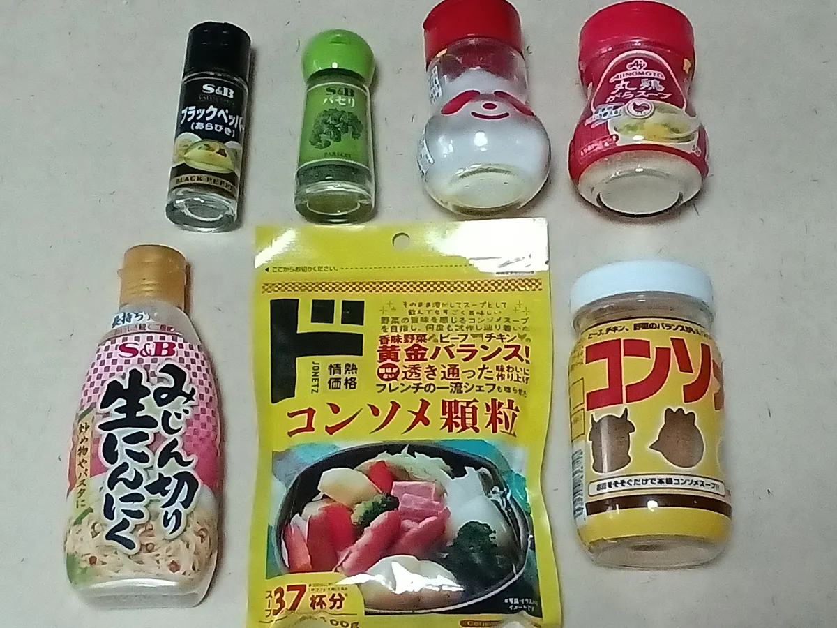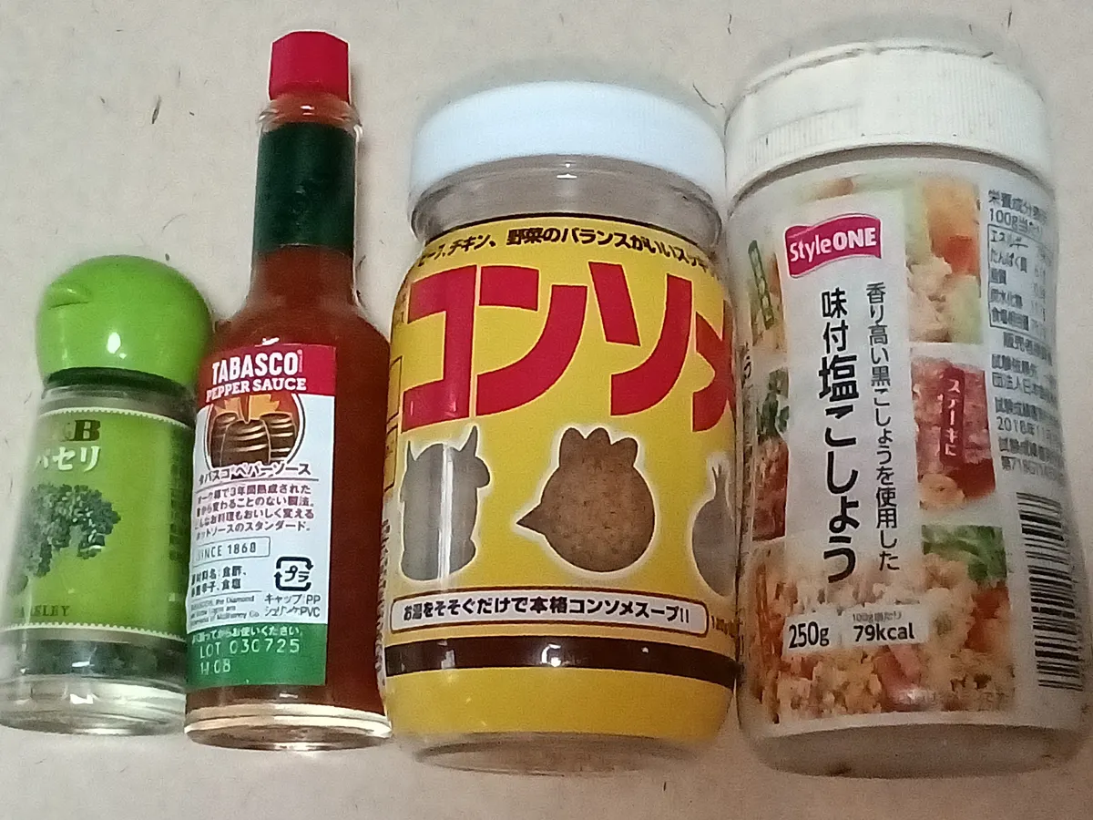 今回私はシンプルに「塩・コショウ」「コンソメスープの素顆粒」だけを使い、最後に「乾燥パセリ」「タバスコ」をふりかけました。
