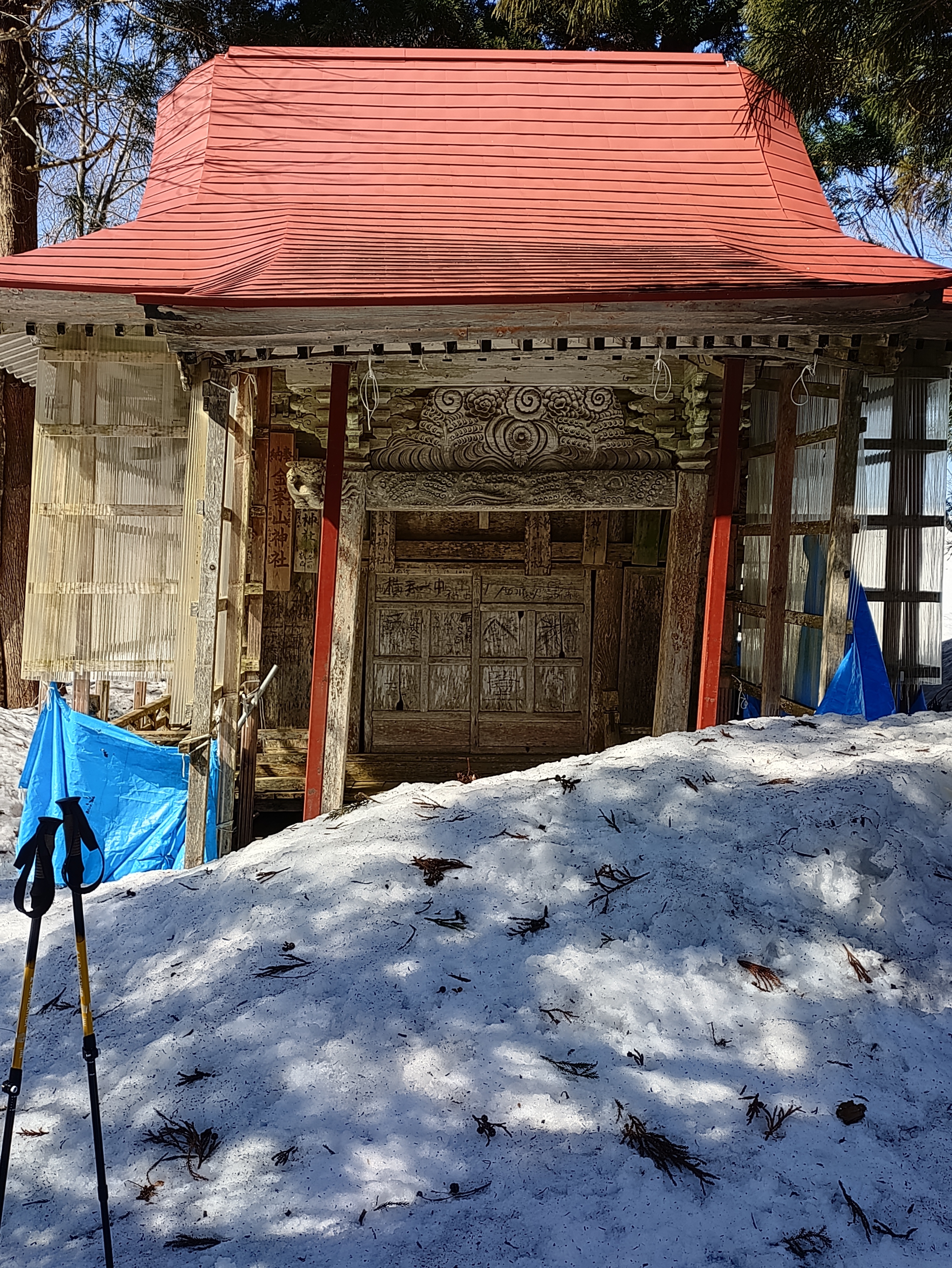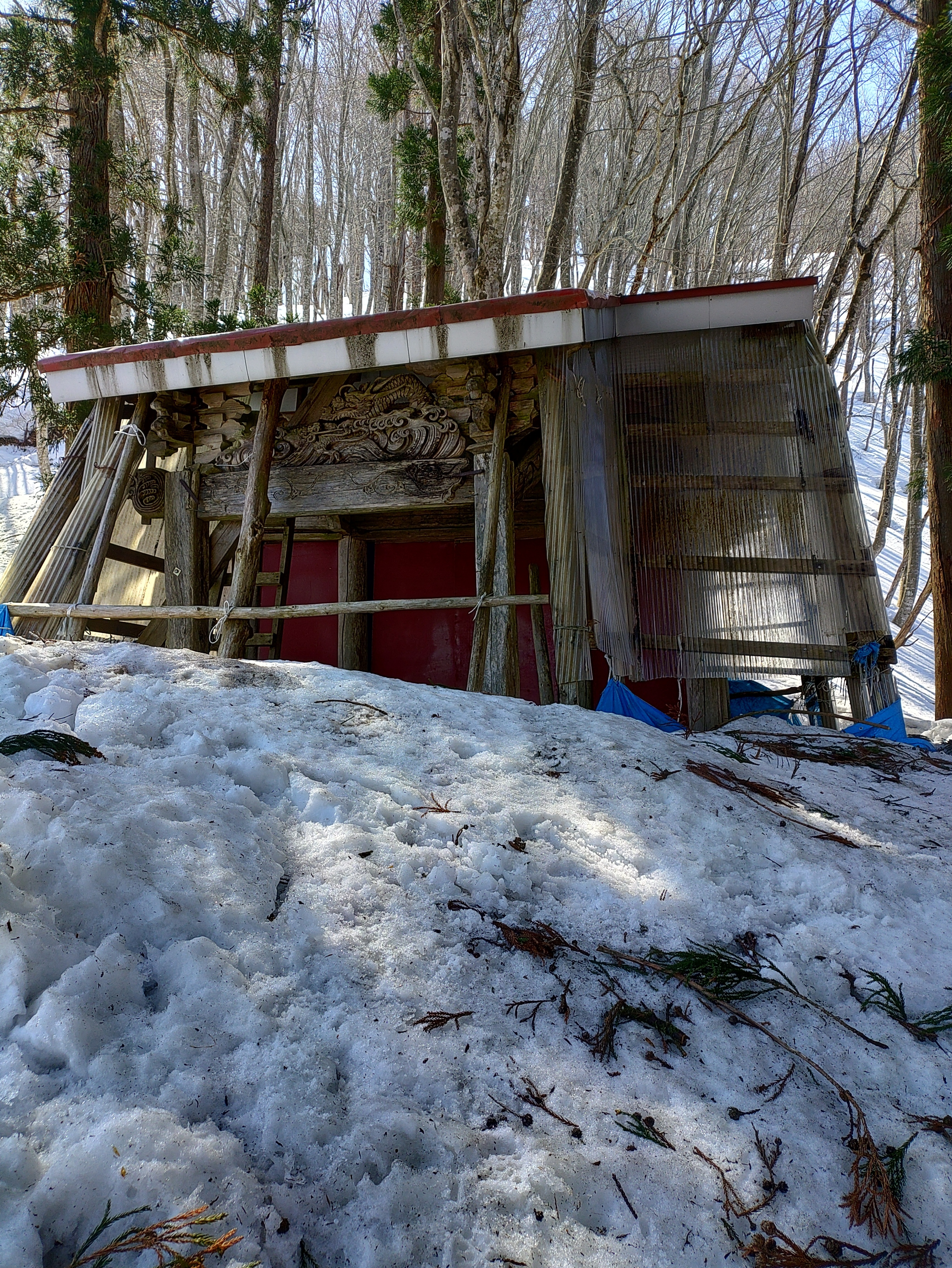 少し上ると小さな神社が…雪の重みなのか右に傾いてます。それでも雪を下ろしたのか梯子が立てかけて有りました。
