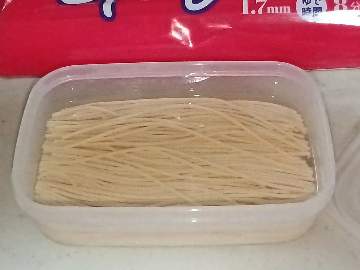 今回のように、思い立った時に「手抜き&時短」料理を作れるように、時間が有る時にパスタ(乾麺)を75gに計量し、半分に折って塩水を入れたタッパーで冷蔵庫にいくつも保存してあります。『水漬けパスタ』ですね~✨️