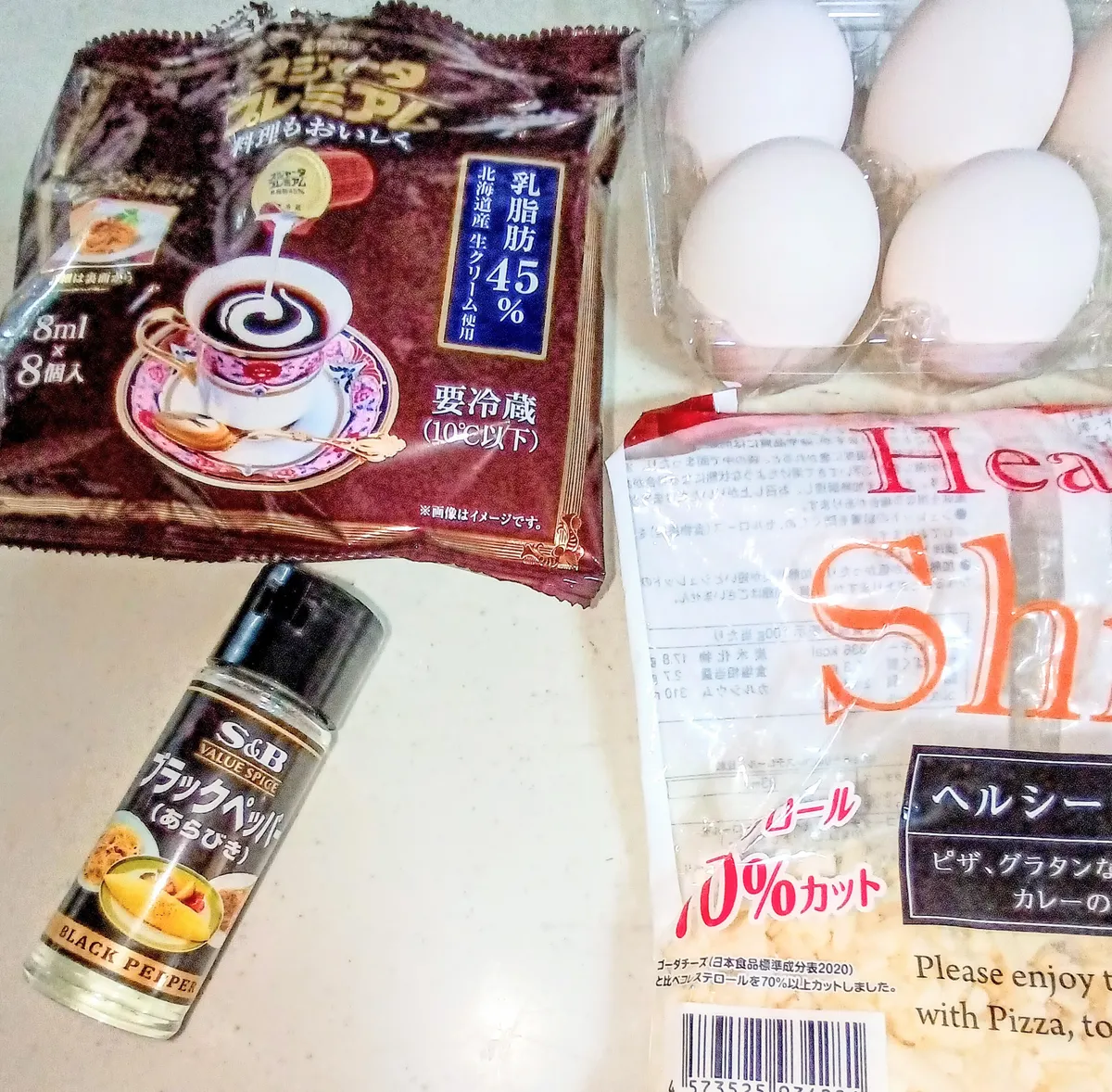 カルボナーラのソースは、「生卵」と「ピザチーズ」と「珈琲用のフレッシュ」をボウルに入れて、「黒胡椒」を少々加え混ぜてるだけです🎶
