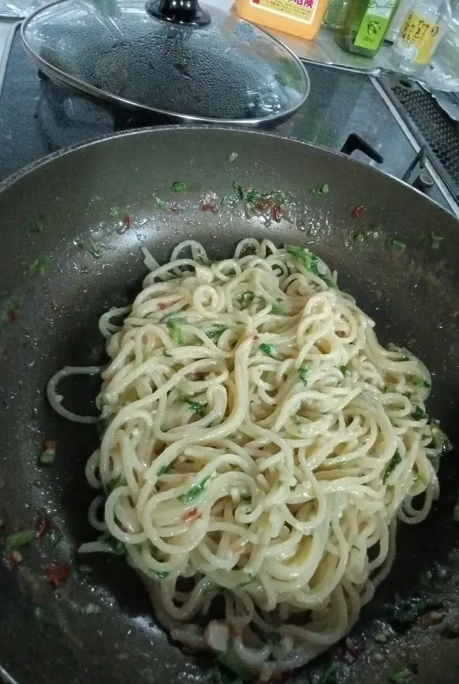塩水を吸ったパスタは柔らかくなっているので、そのままフライパンにかければすぐに茹で上がり、本当に時間とガス代の節約になっています⌚