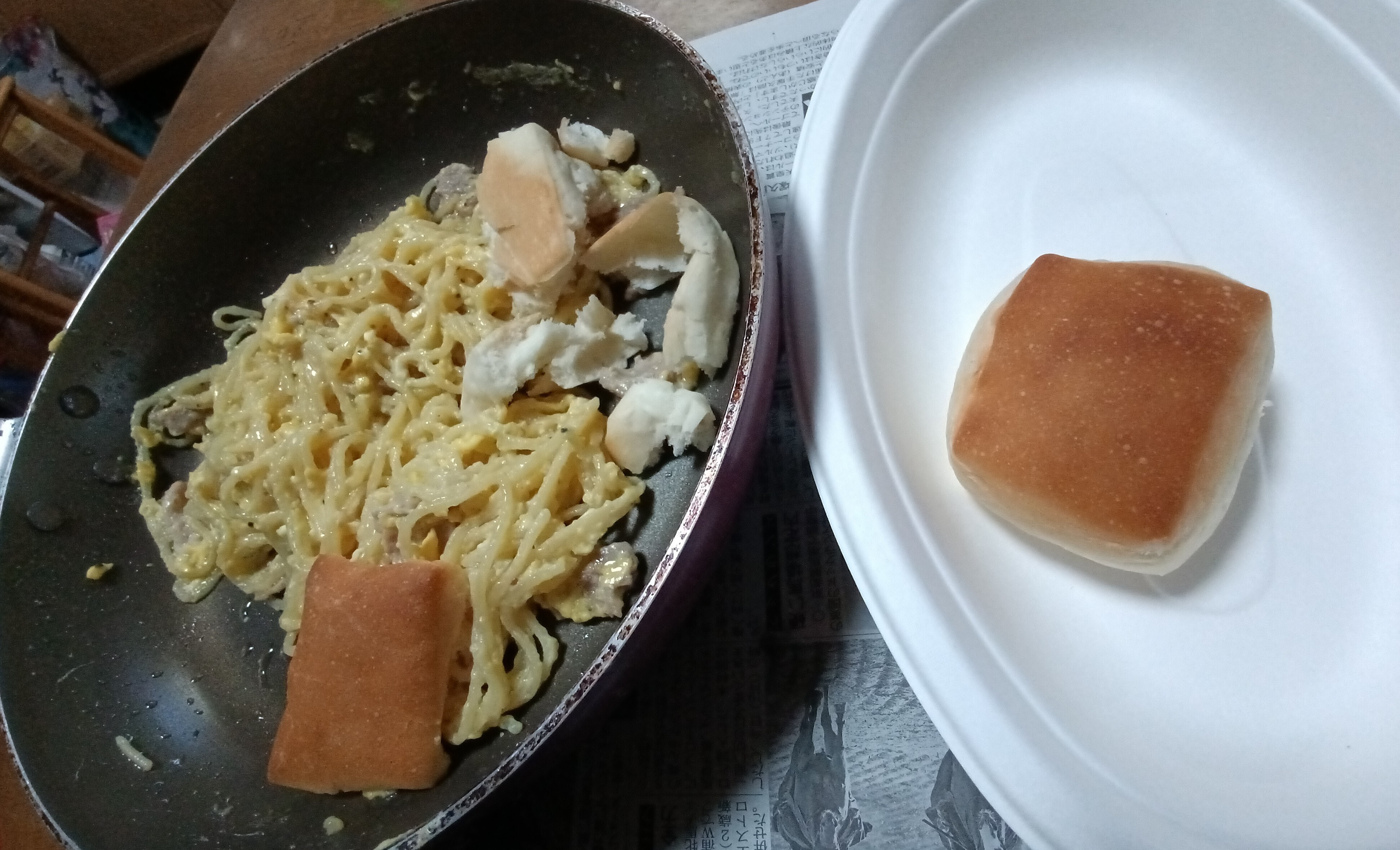 パスタ「カルボナーラ」🍝と、近くのスーパーで買ってきて冷凍保存してあった、格安な「ロールパン」です🥖