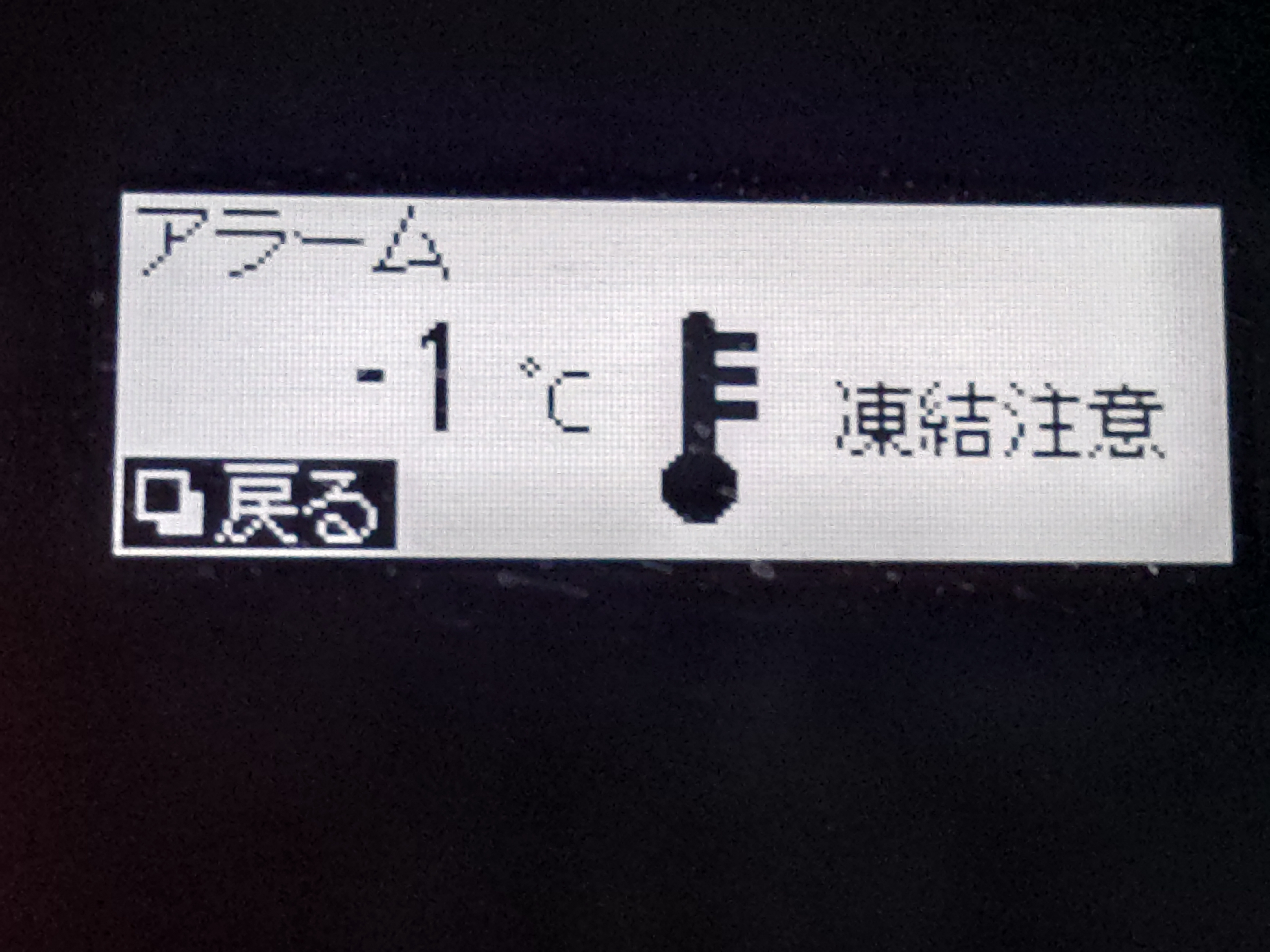 気温1.3℃ 北の風2.1mとなってましたが、吹きっさらしの屋外の駐車場では「外気温-1℃凍結注意」の警告表示