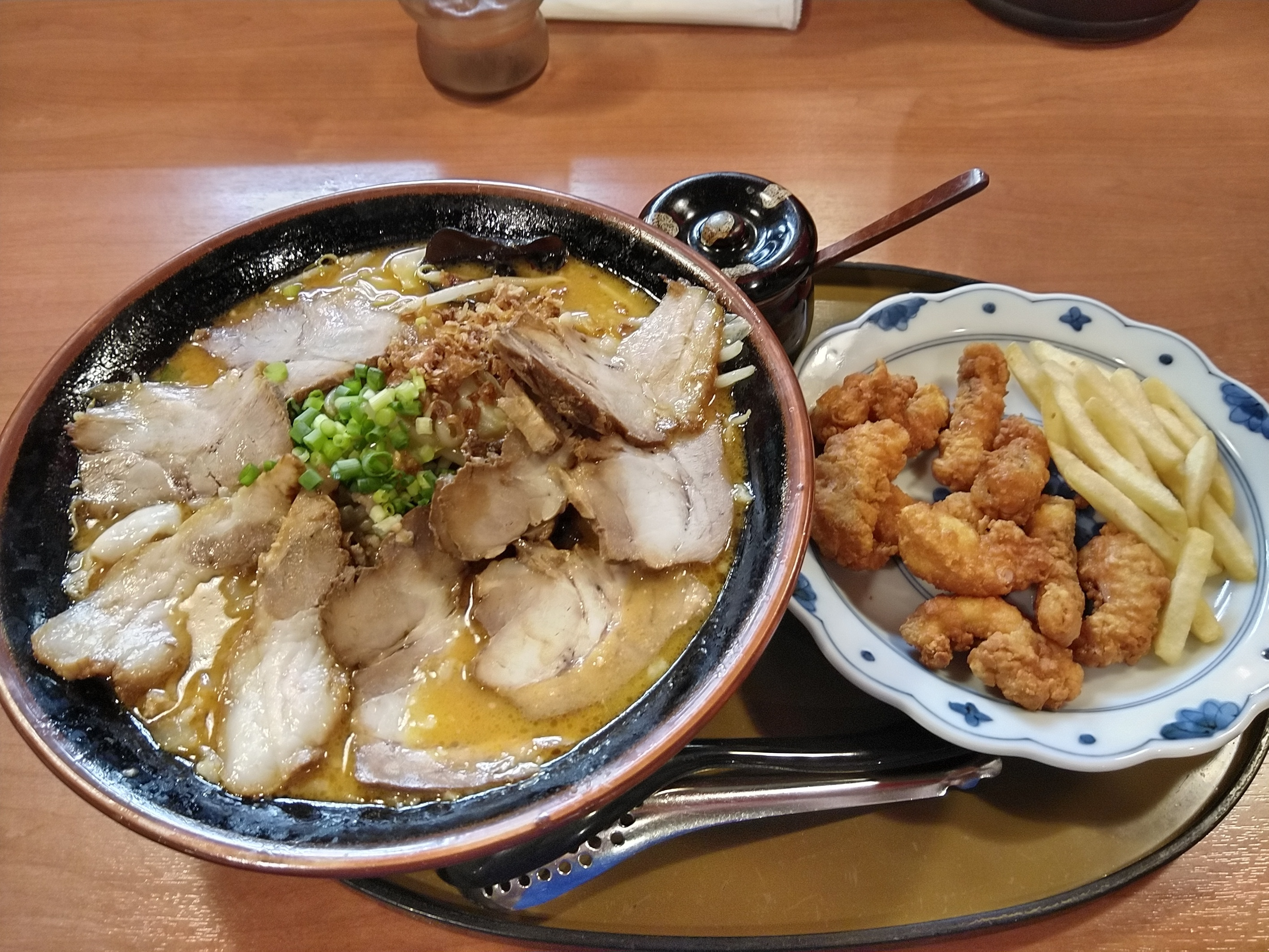 (^-^)三宝亭の新グランドメニューより味噌チャーシュー麺とタコのから揚げポテトです。