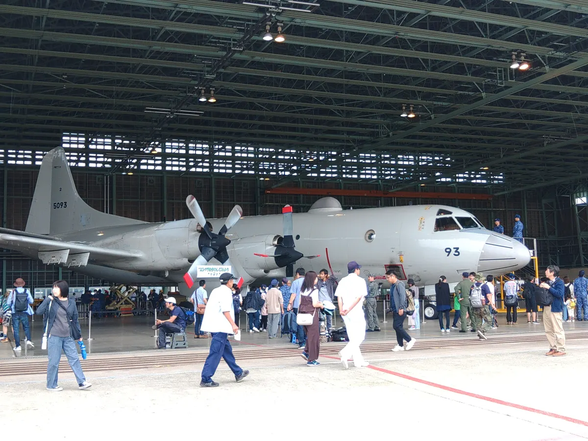 ハンガー内のP3C展示。水平尾翼にさわったり、コクピットの中をのぞいたり、プロペラを手で回してみたりしてました。