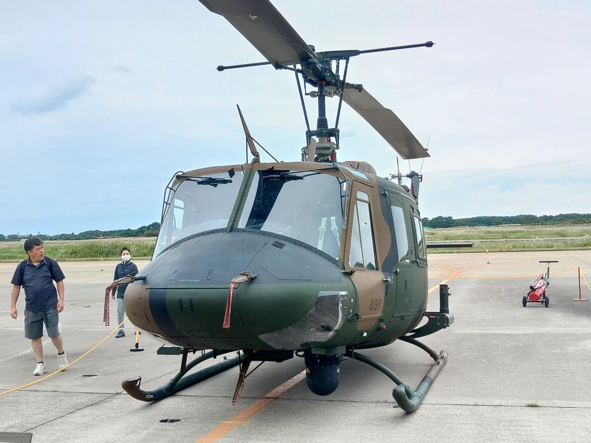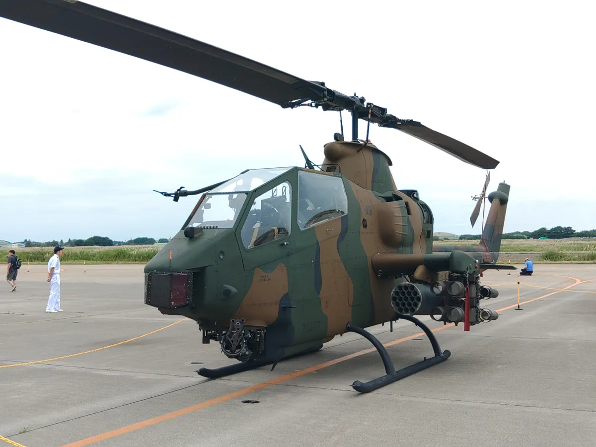陸上自衛隊の攻撃ヘリAH1S。機首のガトリング砲がこっち向いてます。