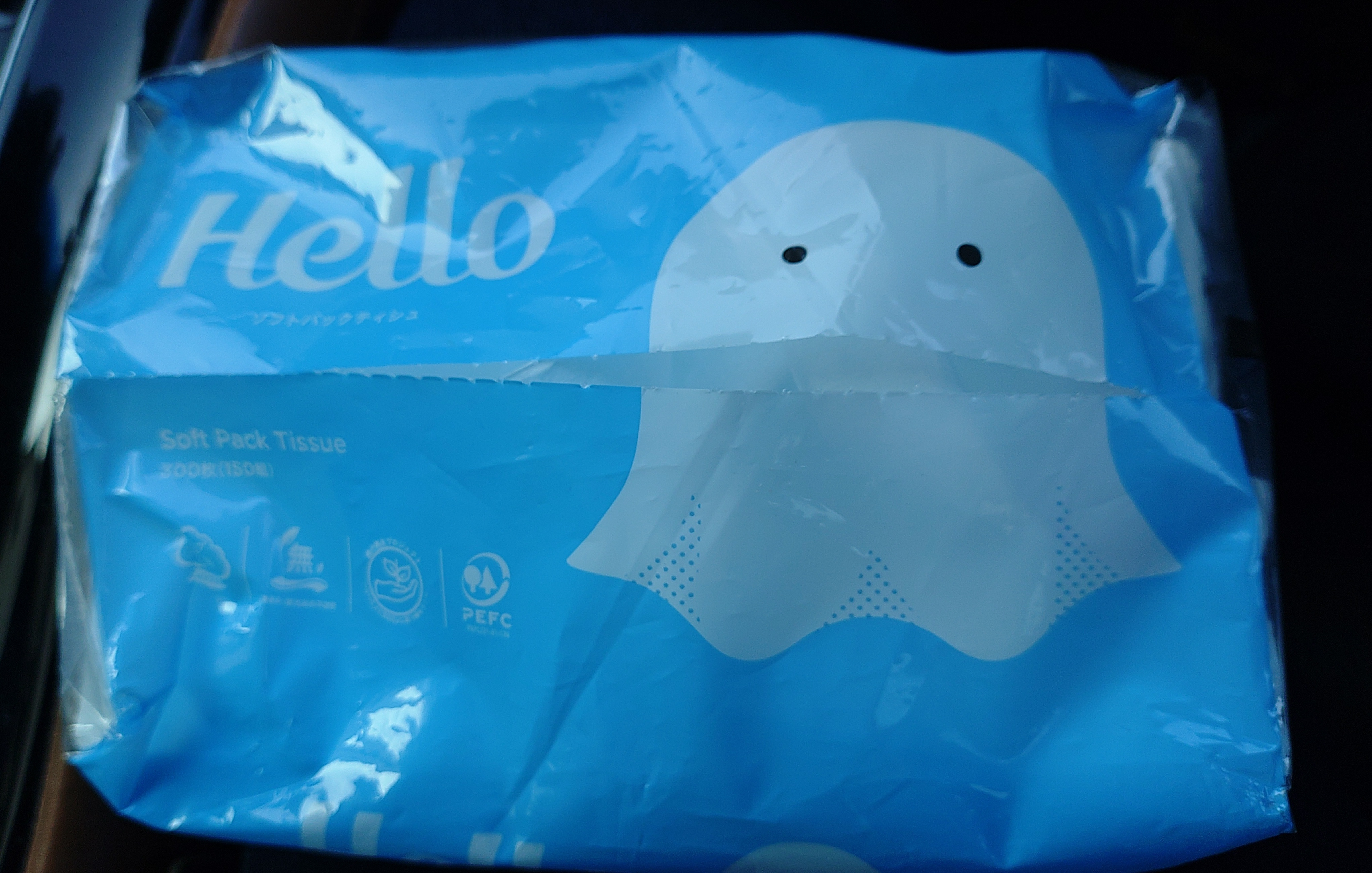 白いクラゲのようなとてもシンプルなキャラクター(?)が書かれているだけではあるのですが、取り出し口を開けると、キャラクターの口からティッシュが出てくるようなイメージになることに気づいて、「おお👀」となりました。絵的にも可愛らしい感じで、これだったらティッシュを使うのが楽しくなりそうです。