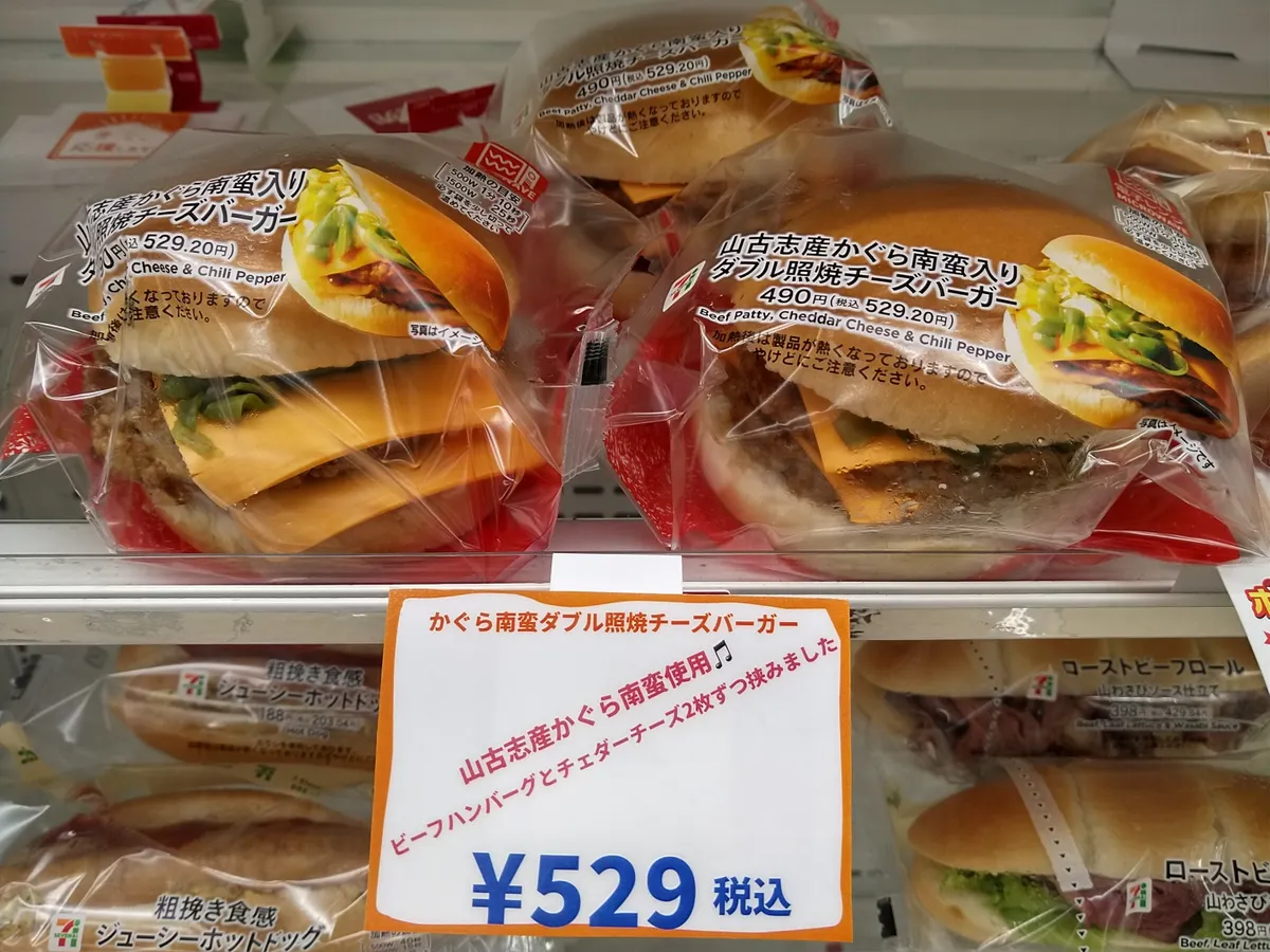 o(^o^)oおそらく全国のセブンでは販売されていないであろう山古志産かぐら南蛮入りダブル照焼チーズバーガーです。小千谷、山古志の名物であるかぐら南蛮が挟まれているんです。