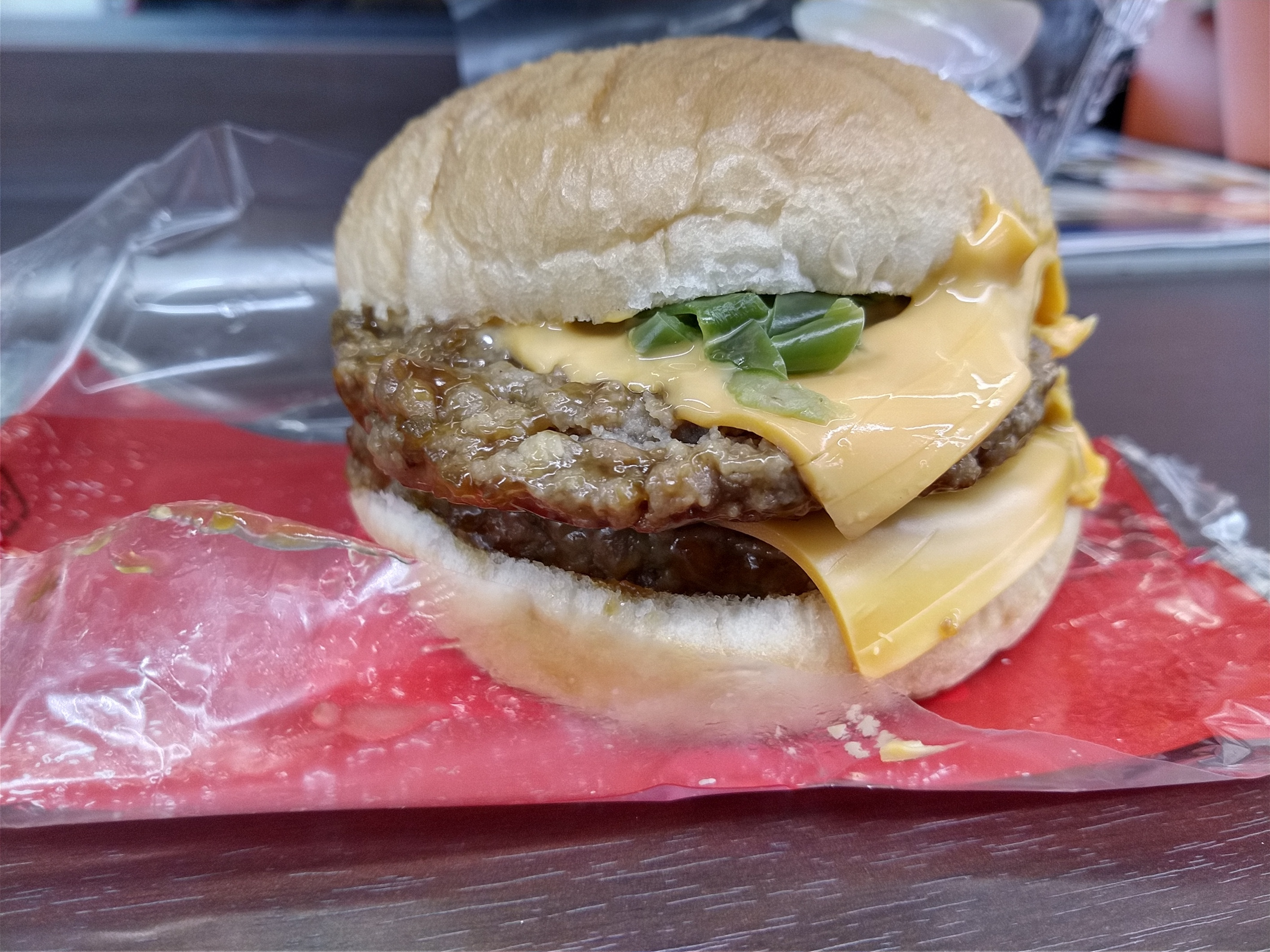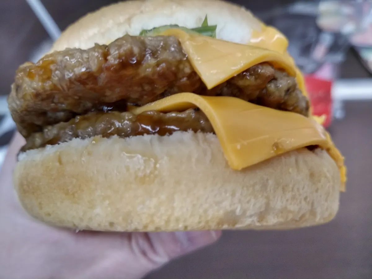 ハンバーグは照焼ソースで分厚く2枚!!チーズも2枚!!ずっしりと超重たいハンバーガーでした。