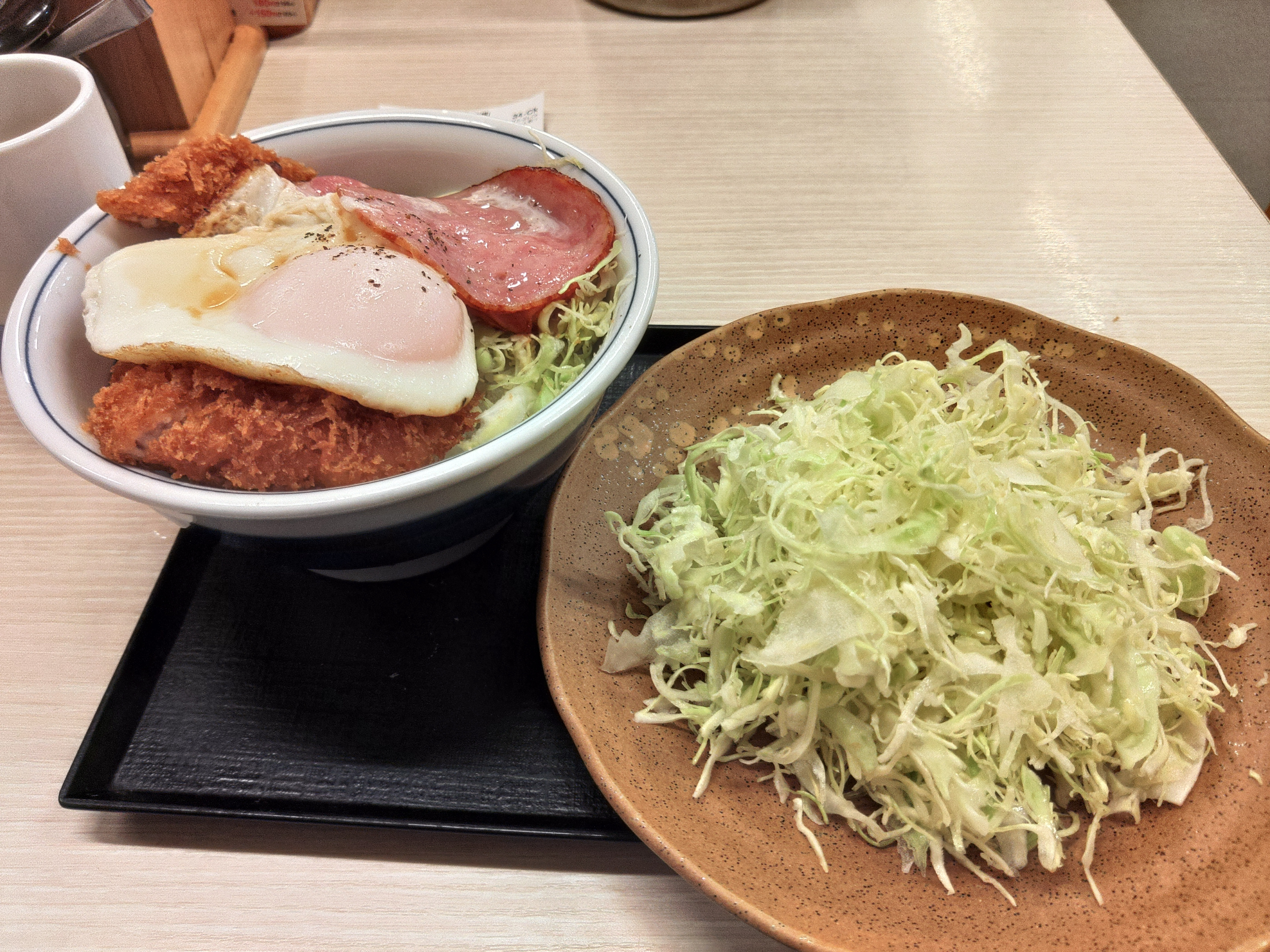 ボロニアソーセージ・ベーコン・チャーシュー・ハムエッグ・ロースカツが御飯・千切りキャベツの上に乗ったメニュー