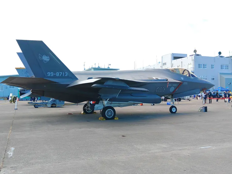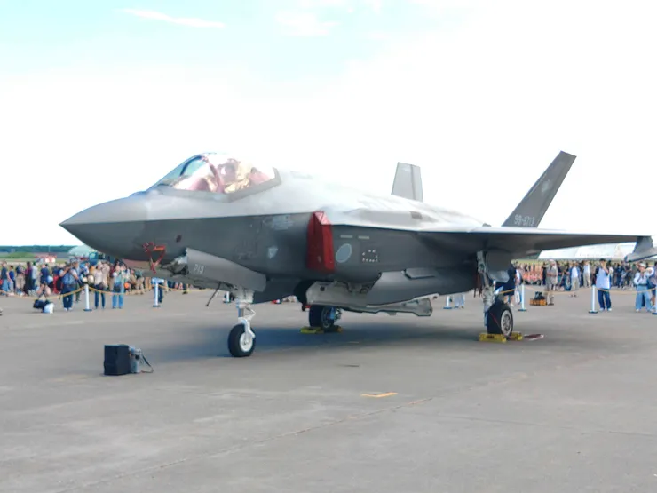 機体下部のウェポンベイを開けた状態で飛んでいます。F-35のフライトを初めて間近で見ましたが、音がでかい!同様にデモフライトを行ったF-16が静かに思えたほど。エンジン推力がF-16の5割増しらしいので、それなりの音なのかと納得しました。それにしても水平旋回のときの旋回速度が異様に速い。これはF-15でも相手にならないかも。パイロットには9Gがかかるそうですが…😱