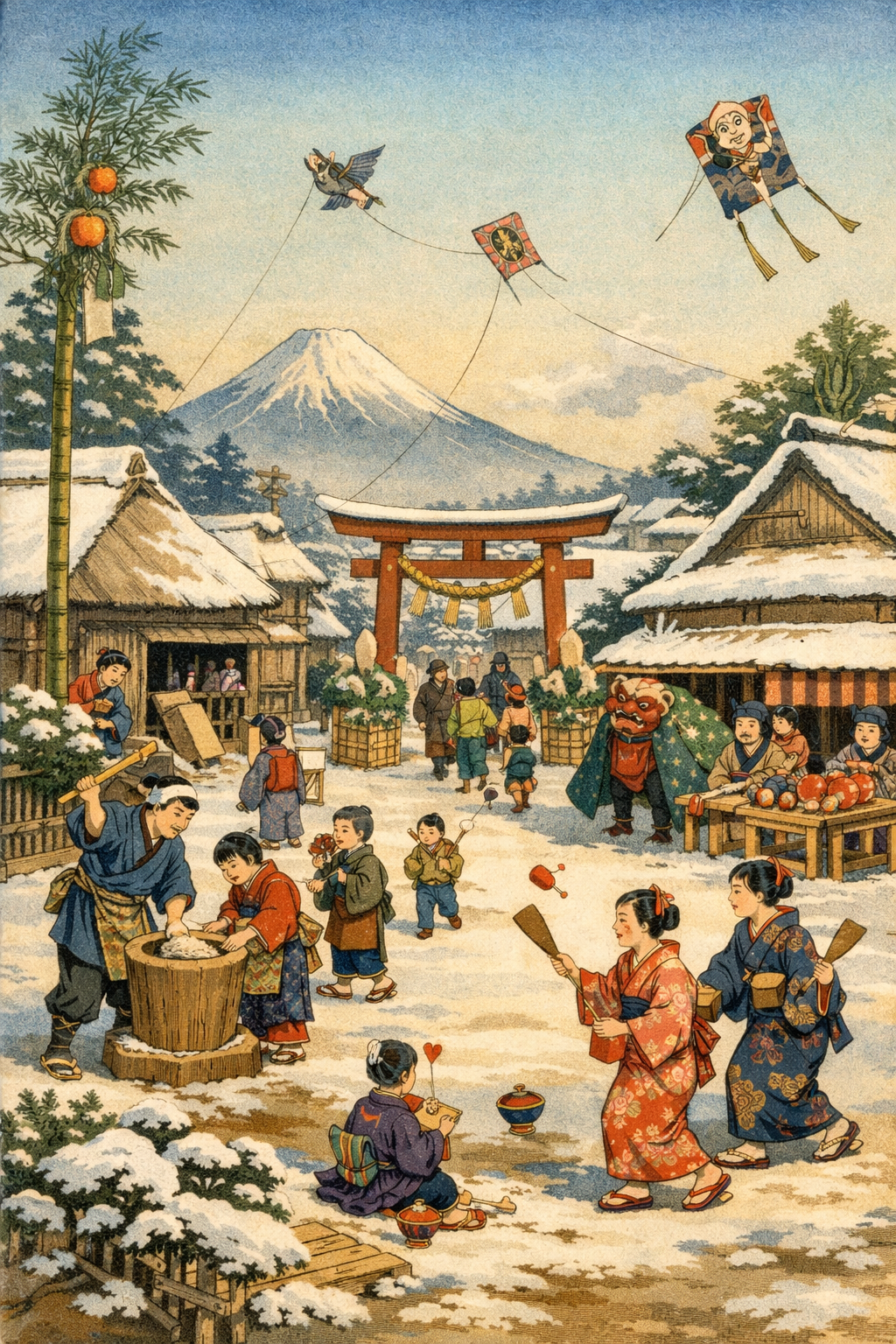 これぞ「ザ・日本のお正月」という風情がありますね。餅搗き、羽子板、凧揚げ… どれも今では失われつつある日本の原風景。素晴らしいです。🤗